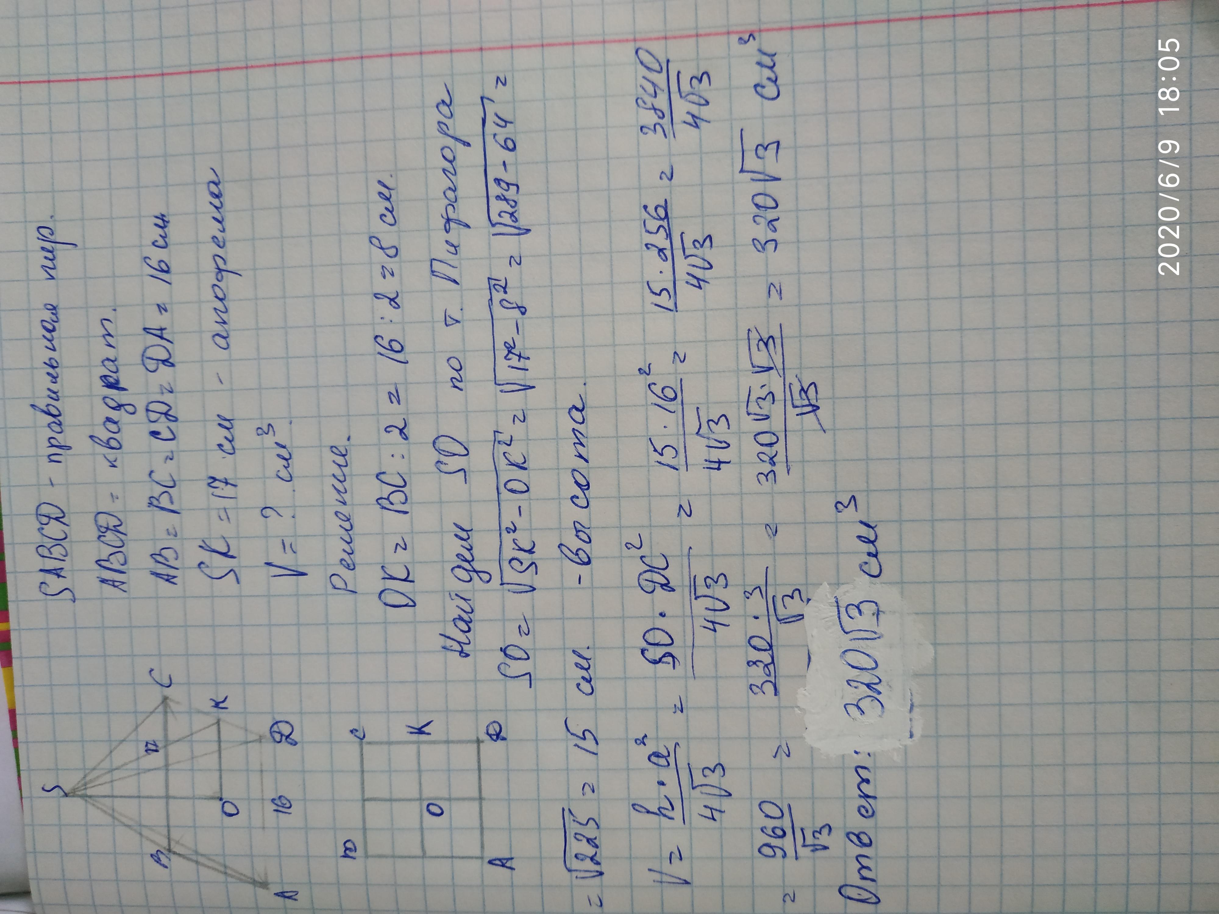 апофема – 17 см. Найдите объём пирамиды.