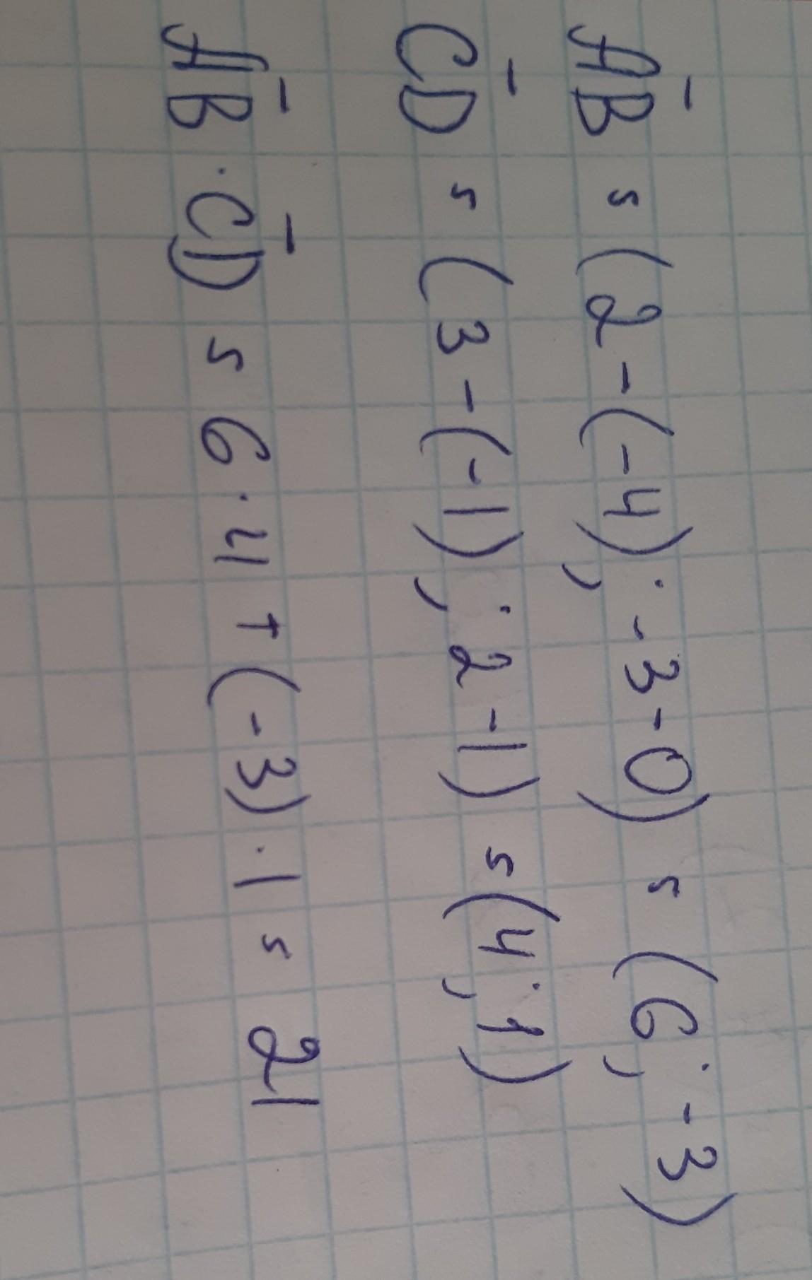Даны точки: А (-4; 0), В (2; -3), С (-1; 1), D (3, 2). Найти скалярное произведение.