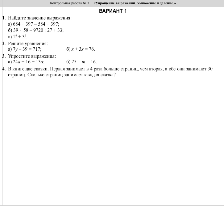 4. В книге две сказки. Первая занимает в 4 раза больше страниц, чем вторая, а обе они занимают 30 страниц. Сколько страниц занимает каждая сказка?
