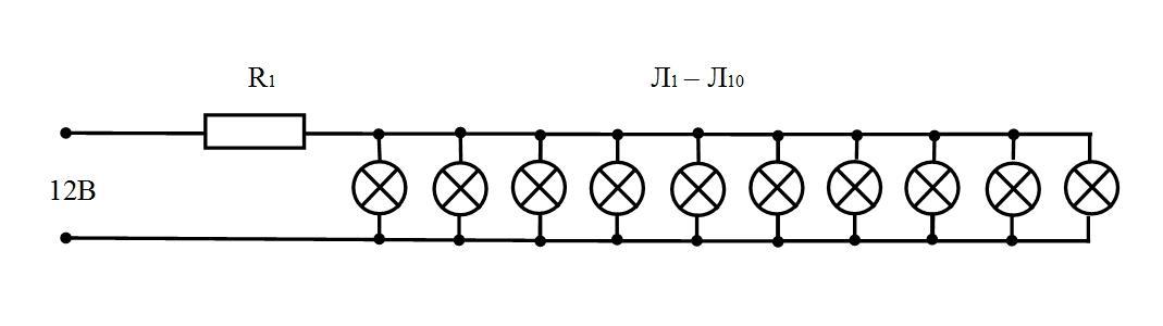 Если 10 Ом - общее сопротивление всех лампочек и все лампочки соединены последовательно (рис.1). Сопротивление одной лампочки в этом случае - 1 Ом :
