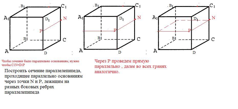 Построить сечение параллелепипеда, проходящее параллельно основаниям через точки N и P, лежащим на разных боковых ребрах параллелепипеда