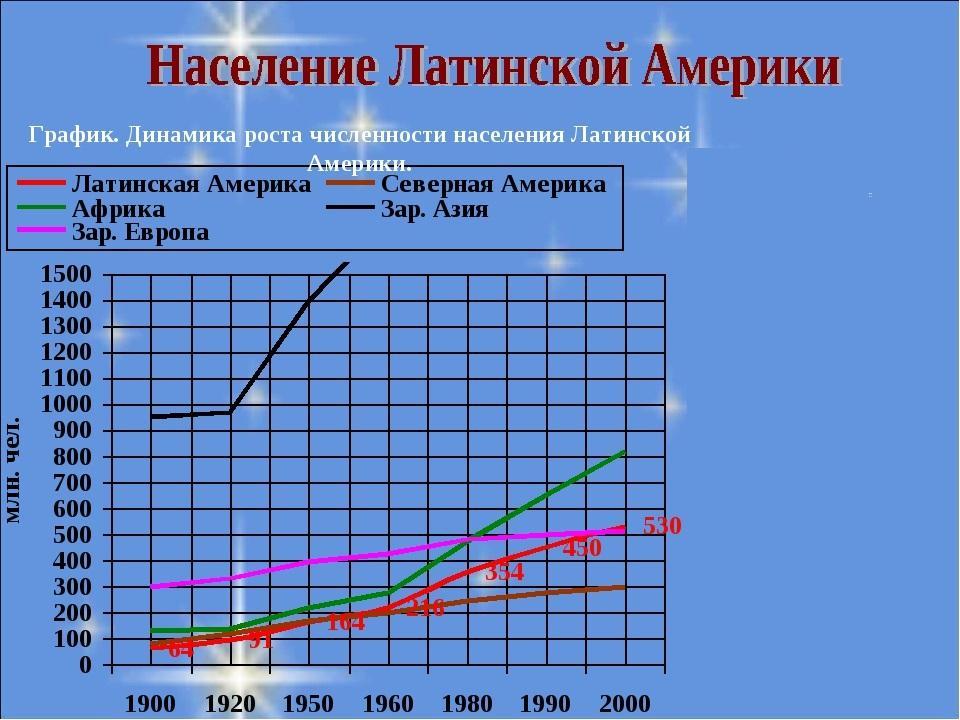 Как видно из графика, который дан ниже в приложении, на начало 20 века численность населения в Латинской Америке составляла порядка 64 млн. чел., а сейчас она составляет 627 млн. чел.