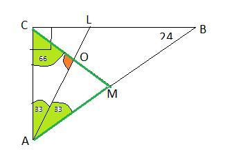 "найдите величину угла между медианой СМ и биссектрисой АL,если угол B равен 24 градуса" На чертеже угол С равен 90.