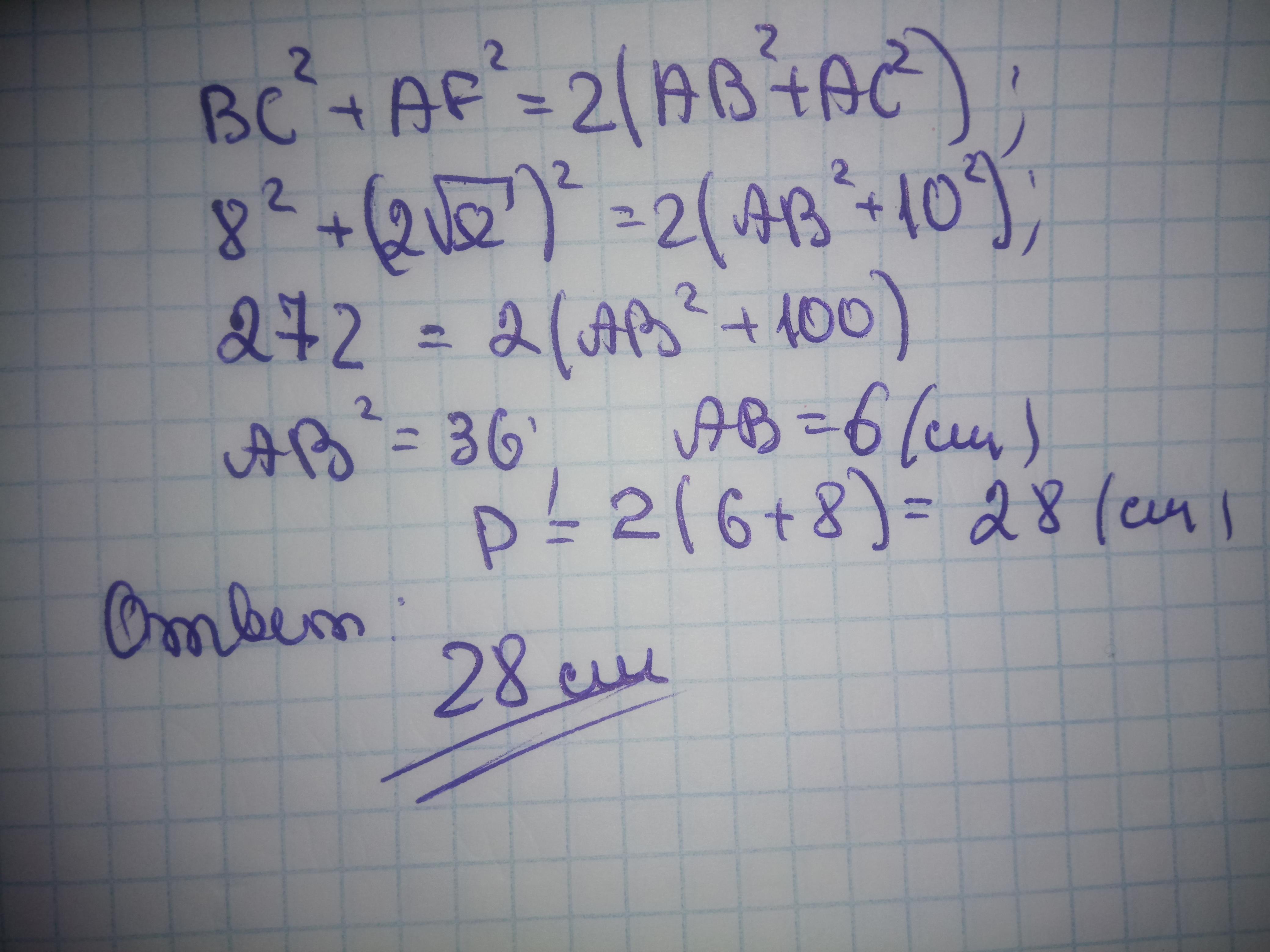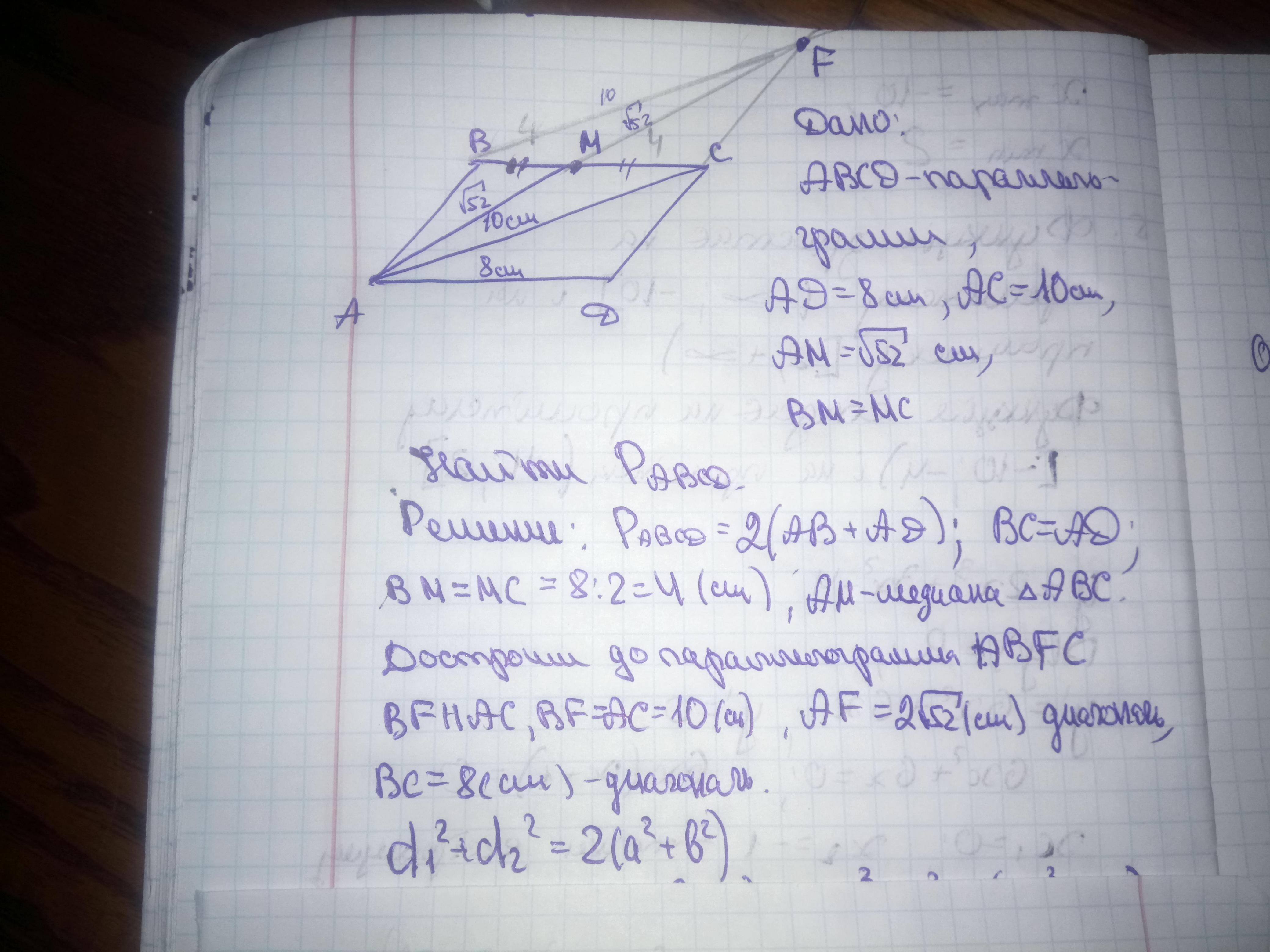 2 способ. С помощью формулы диагоналей параллелограмма.