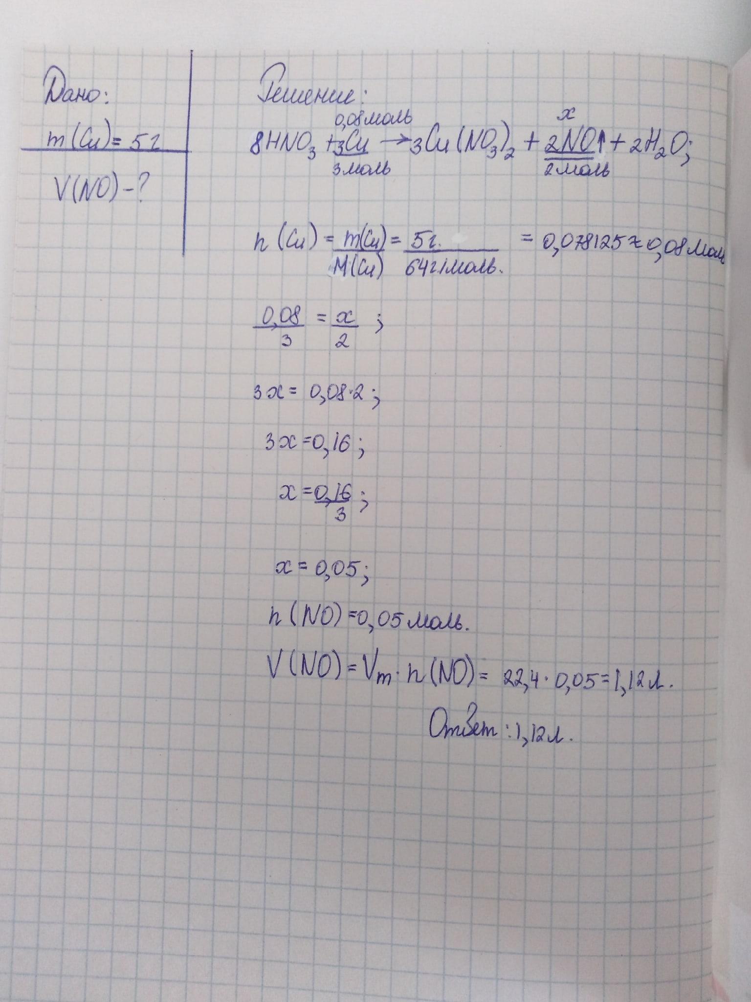 Какой объем азота (II) оксида выделится при взаимодействии разбавленной азотной кислоты с медью массой 5 г?
