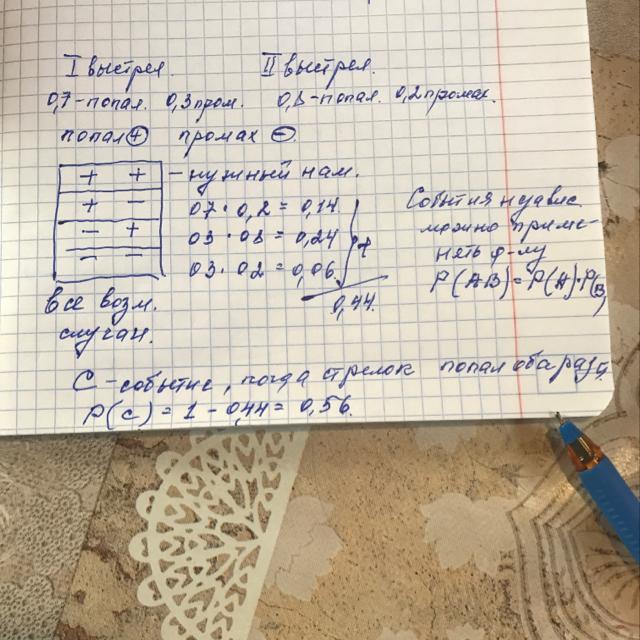 Стрелок стреляет по мишени 2 раза. При первом выстреле вероятность попадания в цель равна 0,7, а при втором – равна 0,8 независимо от результата первого выстрела. Какова вероятность события, что стрелок оба раза попал в мишень?