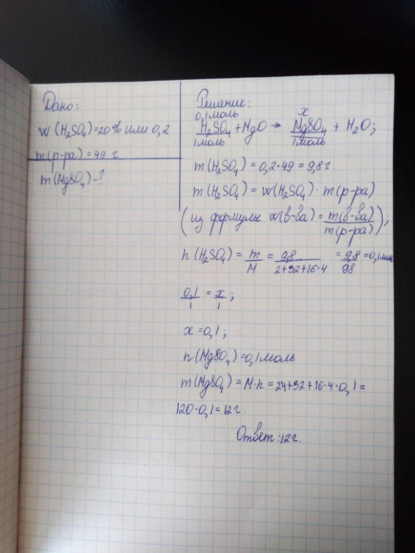 Какая масса сульфата магния образуется при взаимодействии 20% раствора сульфатной кислоты массой 49 г с оксидом магния? Ответ: число, соответствующее рассчитанной массе. *