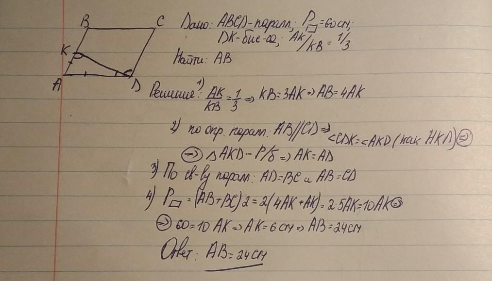 Бісектрисв кута D паралелограма ABCD ділить сторону AB на відрізки AK і KB так, що AK:KB=1:3. Знайдіть AB, якщо периметр паралелограма дорівнює 60 см.