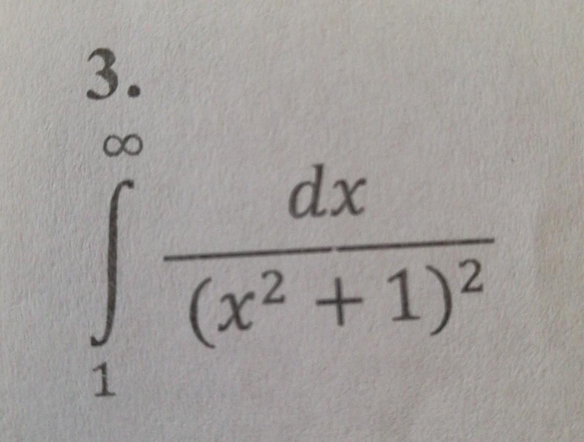 \displaystyle\\\int\limits^\infty_1 {\frac{dx}{(x^2+1)^2} } \, dx\\\\\\\int\limits^\infty_a {f(x)} \, dx= \lim_{b \to +\infty} F(x)\mid^b_a\\\\\\ \int \frac{dx}{(x^2+1)^2}=\frac{x}{2(x^2+1)}+\frac{1}{2}\int\frac{1}{x^2+1}dx=\frac{x}{2(x^2+1)}+\frac{1}{2}\arctan(x)\\\\\\ \lim_{b \to +\infty}  (\frac{x}{2(x^2+1)}+\frac{1}{2}\arctan(x))\mid^b_1= \lim_{b \to +\infty} (\frac{b}{2(b^2+1)}+\frac{1}{2}\arctan(b)-\\\\\\-(\frac{1}{2(1^2+1)}+\frac{1}{2}\arctan(1)))=
