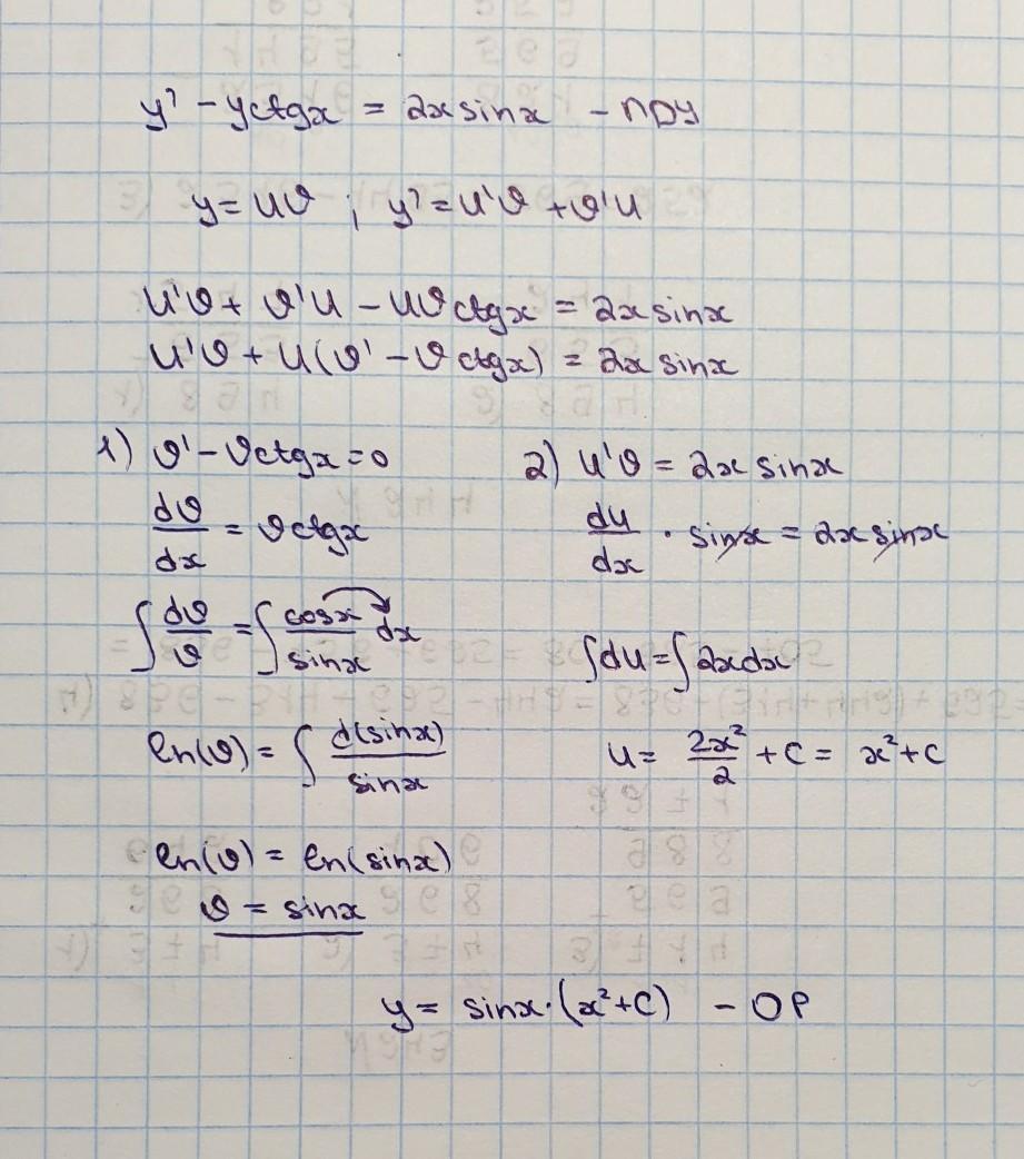 Найти общее решение дифференциального уравнения: y′ − y ∙ ctg (x) = 2x ∙ sin(x)