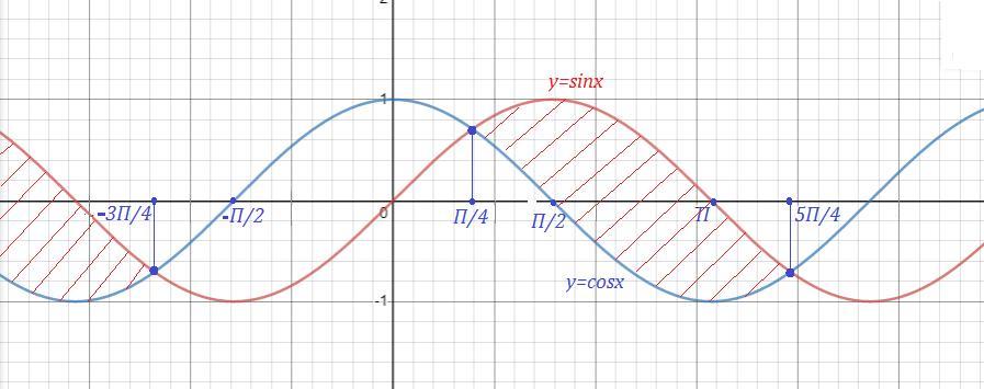 Перейдём в координаты u=sinx; v=cosx. Решением будет выколотая полуокружность заданная системой u^2+v^2=1; u>v. Для х это от pi/4+2pik до 5pi/4+2pik не включая концы, где к - целое