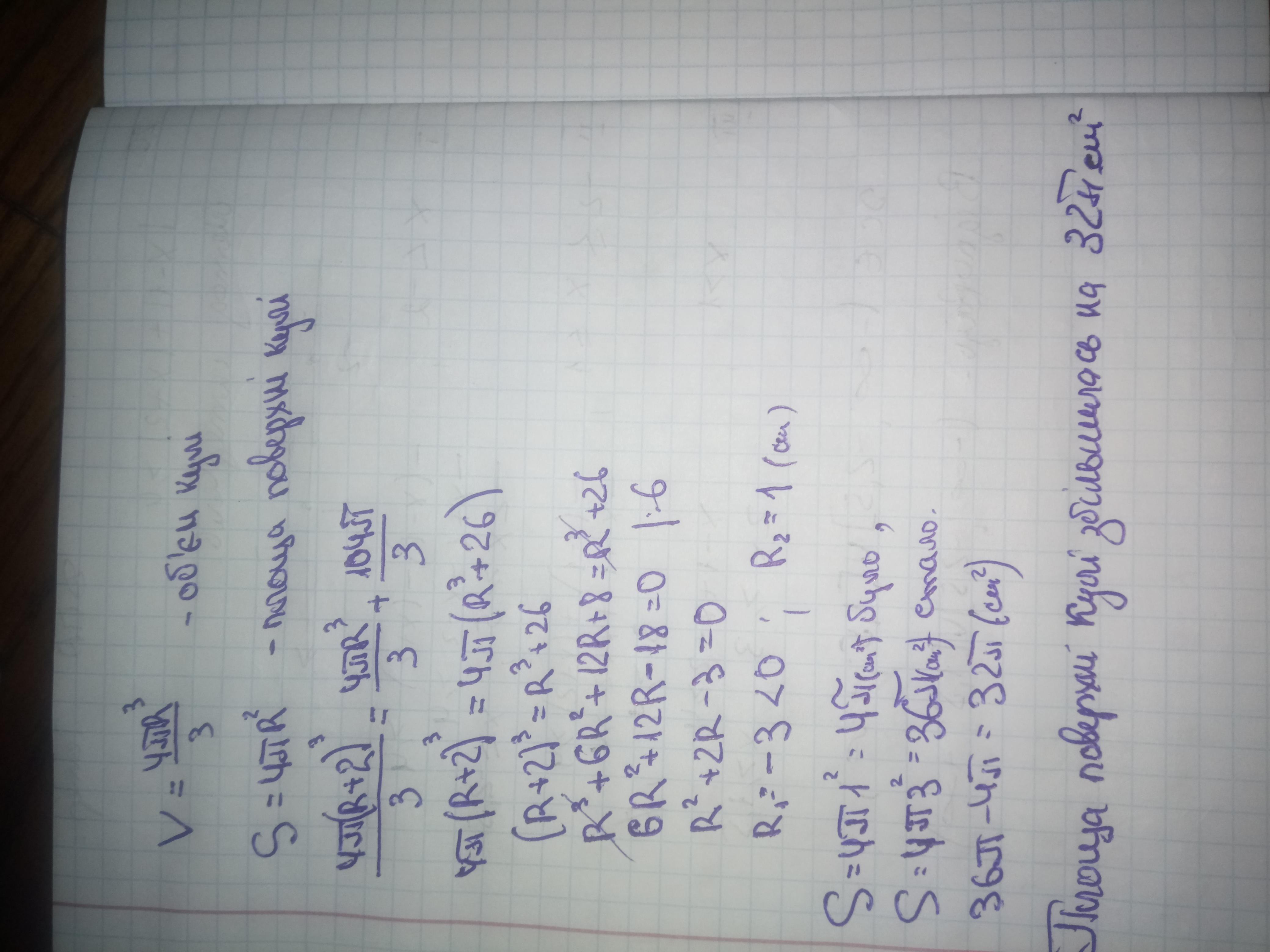 При збільшенні радіуса кулі на 2 см її об’єм збільшився на 104pi/3. На скільки при цьому збільшиться площа поверхні кулі?