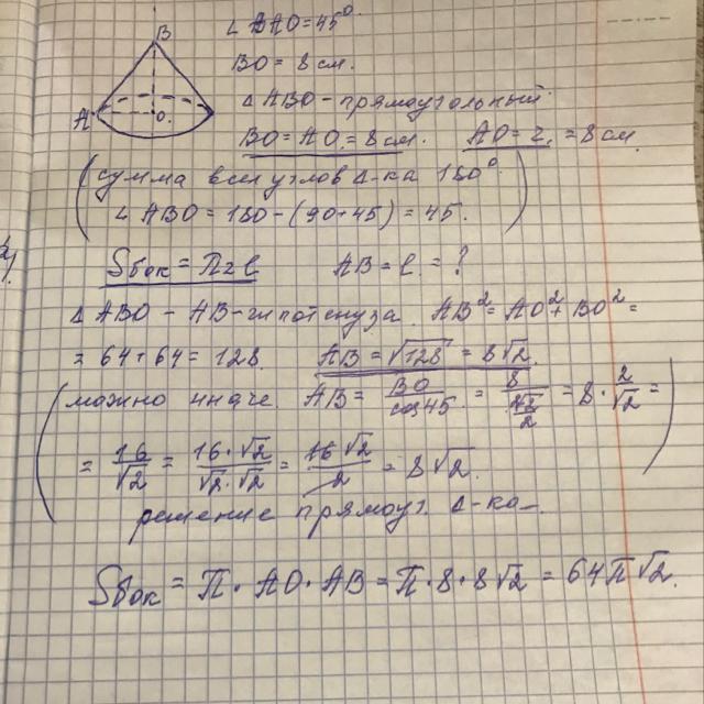 Образующая конуса наклонена к плоскости основания под углом 45градусов. Высота конуса равна 8 см. Найти площадь боковой поверхности конуса.