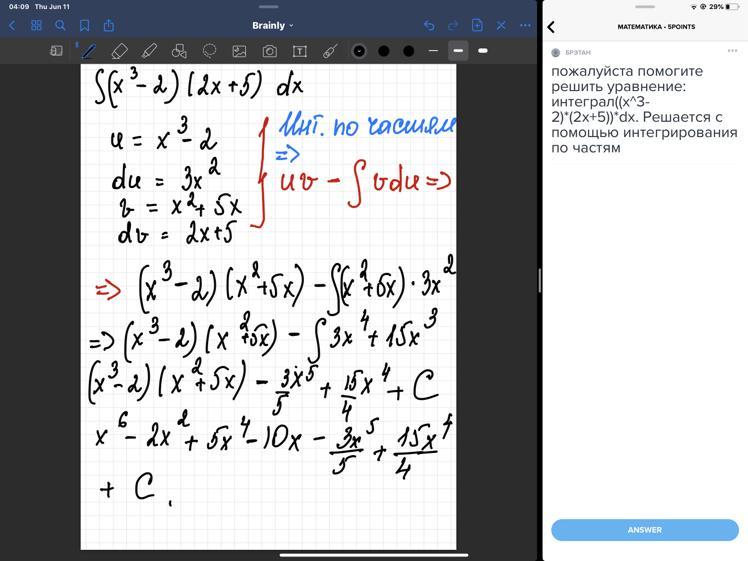 пожалуйста помогите решить уравнение: интеграл((x^3- 2)*(2x+5))*dx. Решается с помощью интегрирования по частям