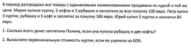 В период распродажи все товары с одинаковыми наименованиями продавали по одной и той же цене. Мария купила куртку, 2 кофты и 3 рубашки и заплатила за всю покупку 100 евро. Петр купил 3 куртки, рубашку и 5 кофт и заплатил за покупку 186 евро. Юрий купил 3 куртки и заплатил 84 евро.
