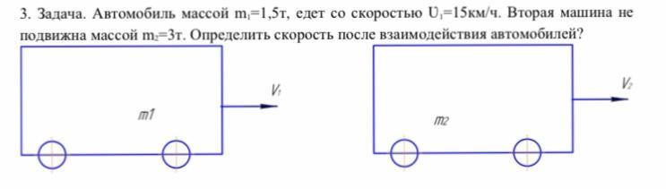 .Автомобиль массой m1=1,5т, едет со скоростью Ʋ1=15км/ч. Вторая машина не подвижна массой m2=3т. Определить скорость после взаимодействия автомобилей?