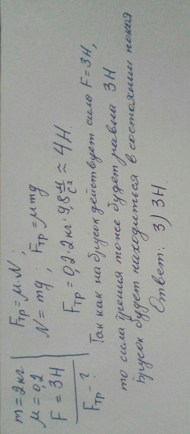 Коэффициент трения между горизонтальной плоскостью и бруском массой 2кг равна 0,2. На брусок действует сила 3Н. Чему равна сила трения
