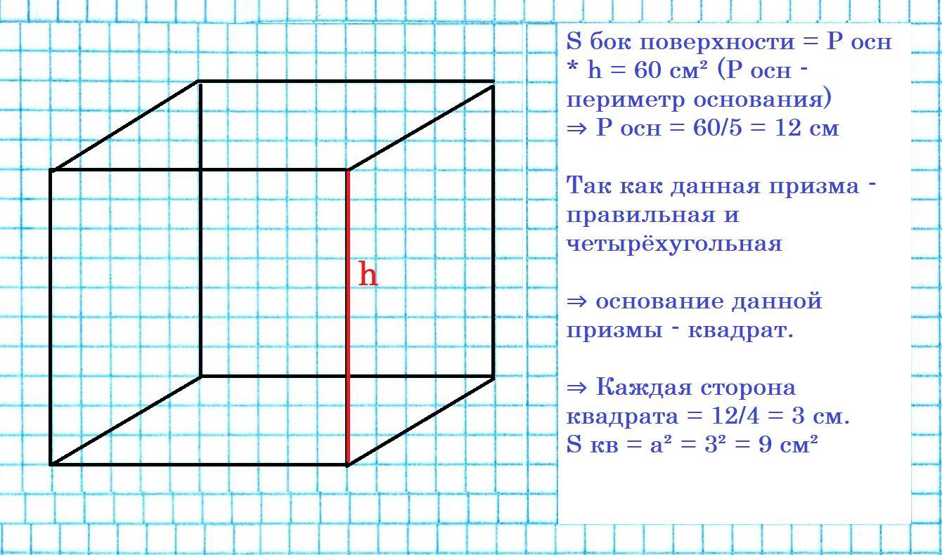 Площадь боковой поверхности правильной четырехугольной призмы 60 см^2, высота призмы 5 см. Найти площадь основания призмы.
