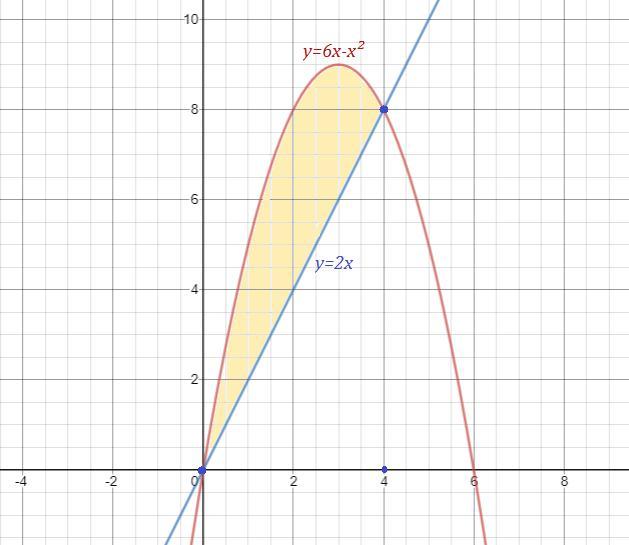 пределы интегрирования равны 6х-х²=2х⇒х=0,х=4