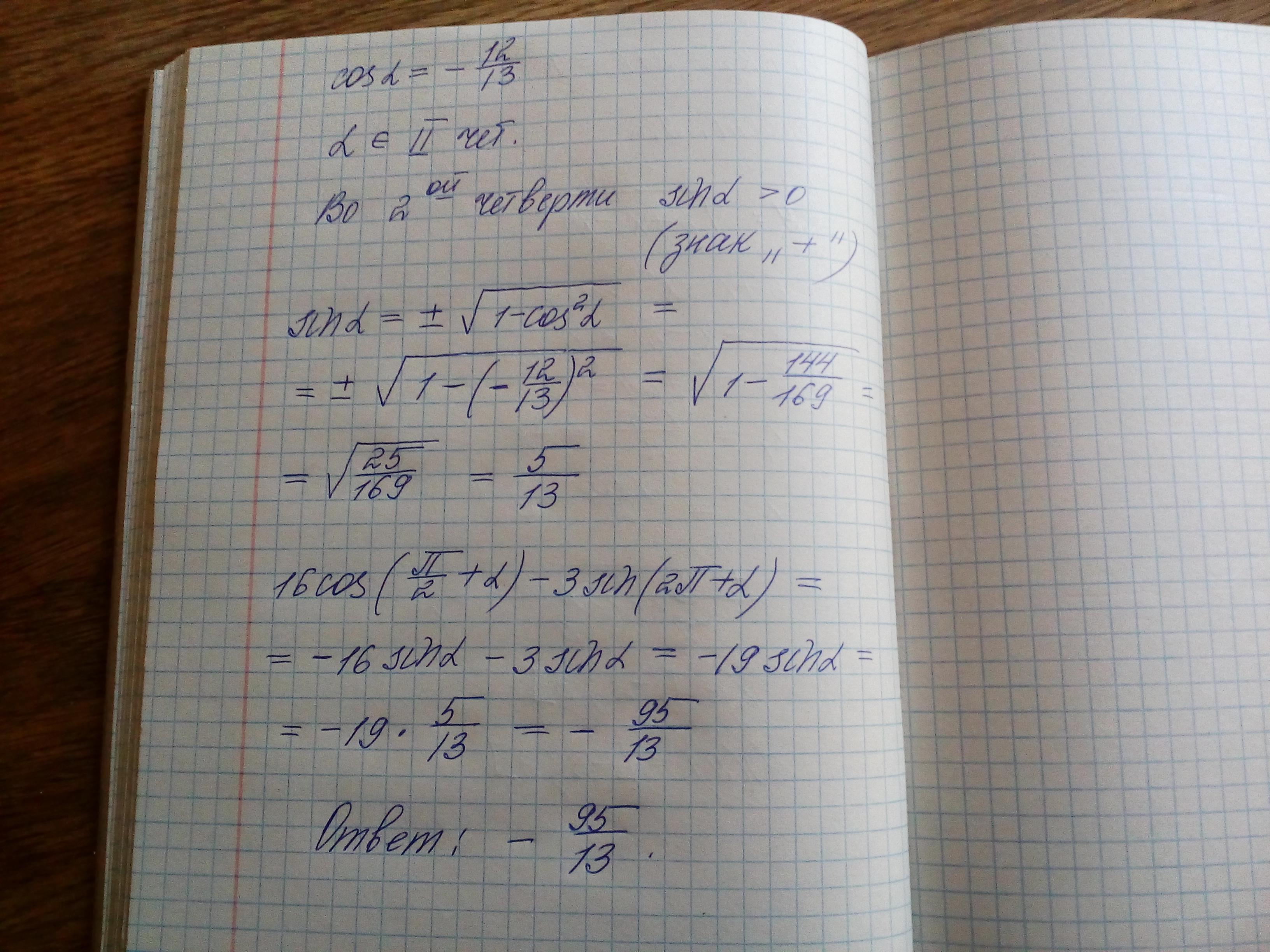 3. Найдите значение выражения 16cos(/2+α)−3sin(2π+α), если cosα=−12/13, и α – угол ΙΙ четверти.