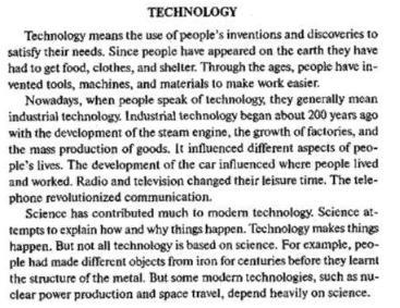 ТЕХНОЛОГИЯТехнология подразумевает использование изобретений и открытий для удовлетворения их потребностей людей. Поскольку люди появились на земле у них получить продовольствие, одежду и жилье. На протяжении веков, люди изобрели инструменты, машины и материалы, чтобы сделать работу легче.В настоящее время когда люди говорят о технологии, они как правило означает промышленной технологии. Промышленные технологии начали около 200 лет назад с развитием парового двигателя, рост заводов и массового производства товаров. Его влияние на различные аспекты жизни людей. Разработка автомобиля, влияние, где люди жили и работали. Радио и телевидения изменил свое свободное время. Коммуникации телефон революцию.Наука внесла большой вклад современной технологии. Наука пытается объяснить, как и почему происходят вещи. Технология делает вещи. Но не все технологии основана на науке. Например люди сделали различные объекты из железа на протяжении столетий, прежде чем они узнали структуру металла. Однако некоторые современные технологии, такие как производство ядерной энергии и космических путешествий, сильно зависят от науки.