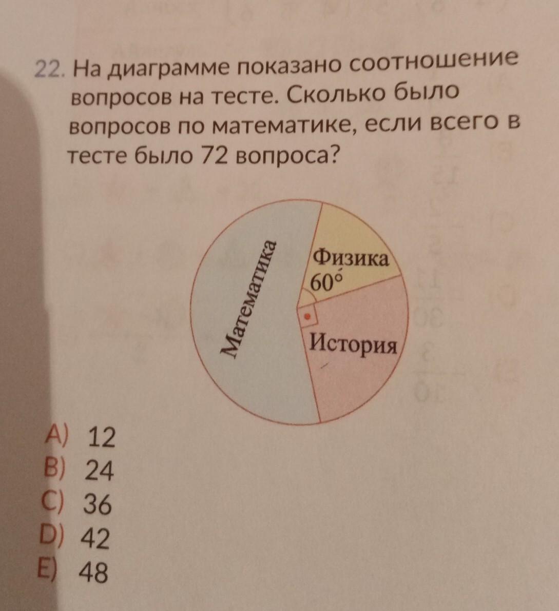 раз у физики 60 градусов, там 12 вопросов, у истории 90 градусов - там 18 вопросов. значит по математике: 72-12-18=42 вопроса
