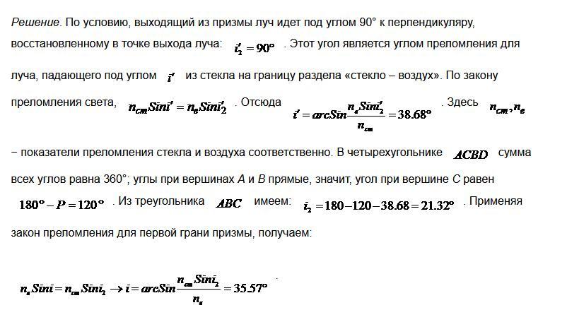 Преломляющий угол стеклянной призмы 60. Под каким углом лучи должны падать на призму, чтобы выходить из нее, скользя вдоль поверхности противоположной грани? Показатель преломления стекла 1,6.