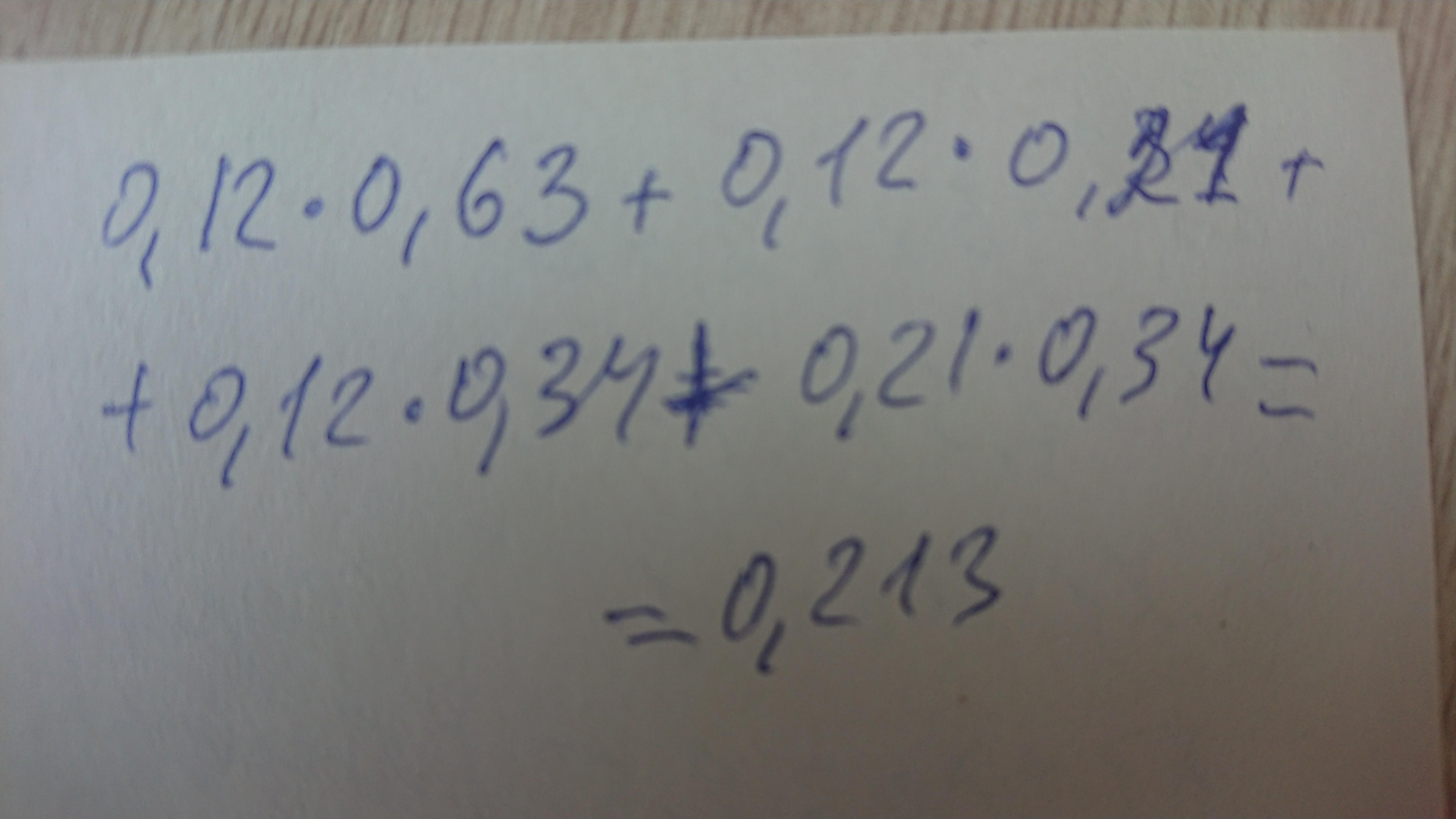 По цели производятся три независимых выстрела. Вероятность попадания в цель при первом выстреле равна 0,12; при втором - 0,21 и при третьем - 0,34. Для поражения цели достаточно двух попаданий. При одном попадании цель поражается с вероятностью 0,63. Найти вероятность поражения цели.