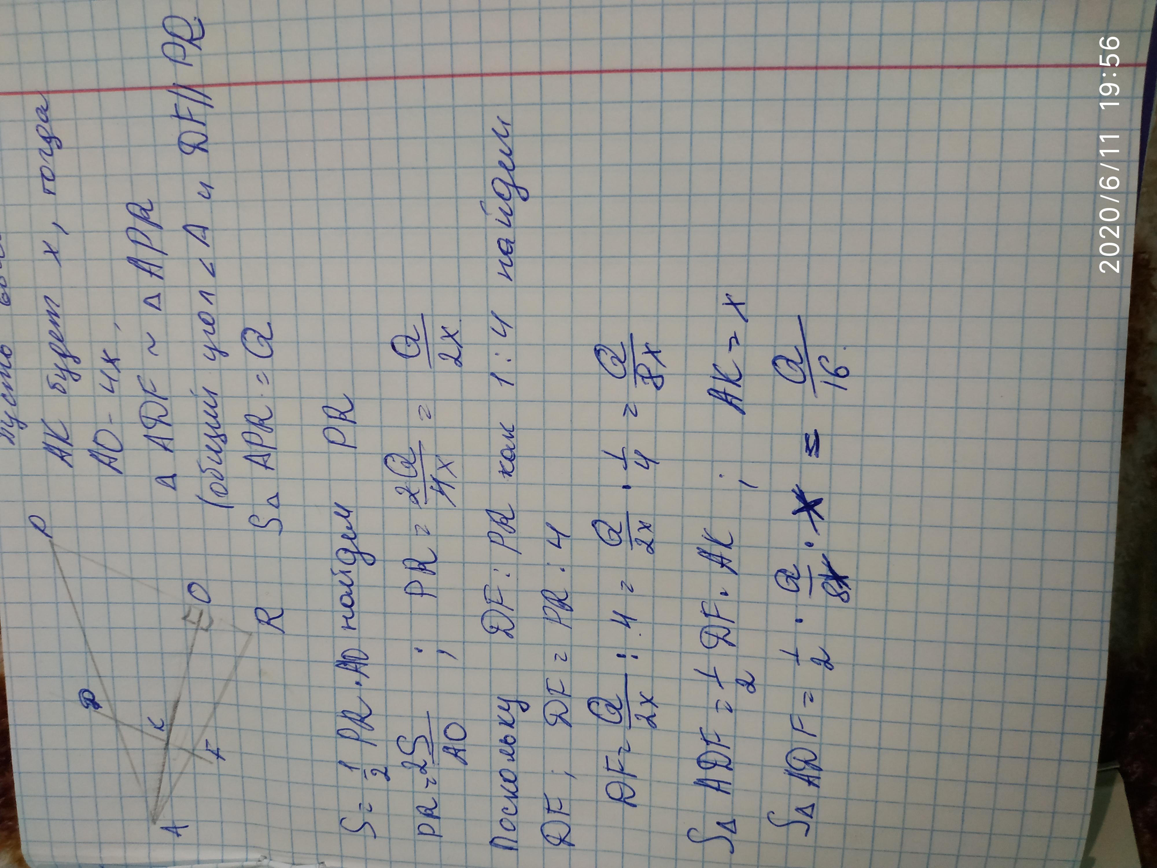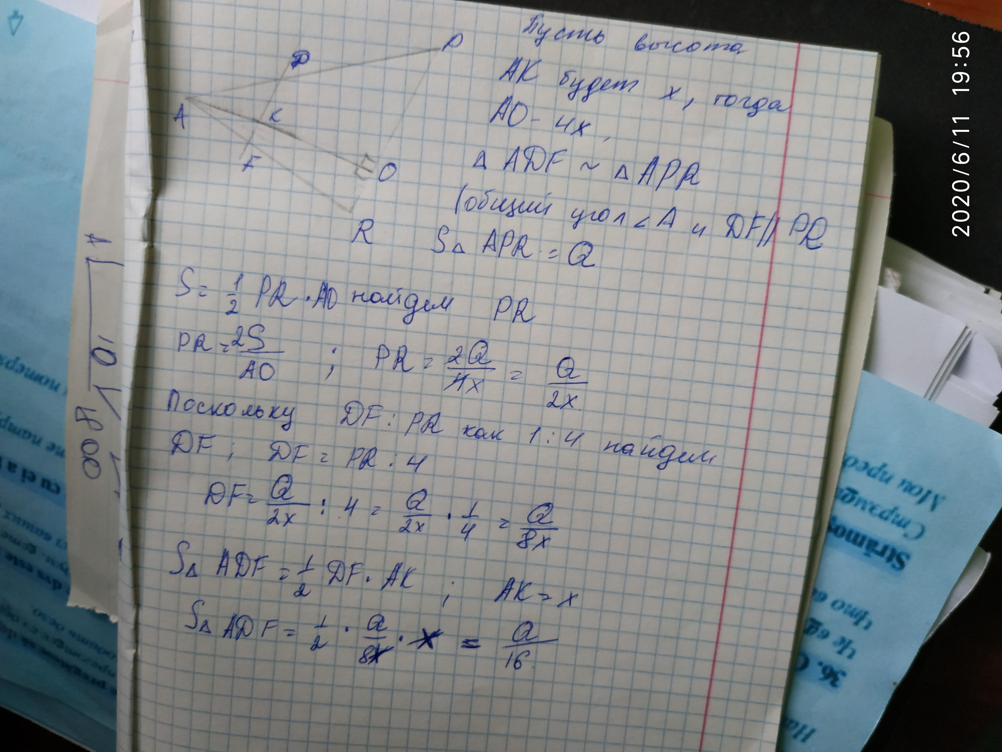 Ответ есть, а то у меня получилось S∆ADF=Q/16