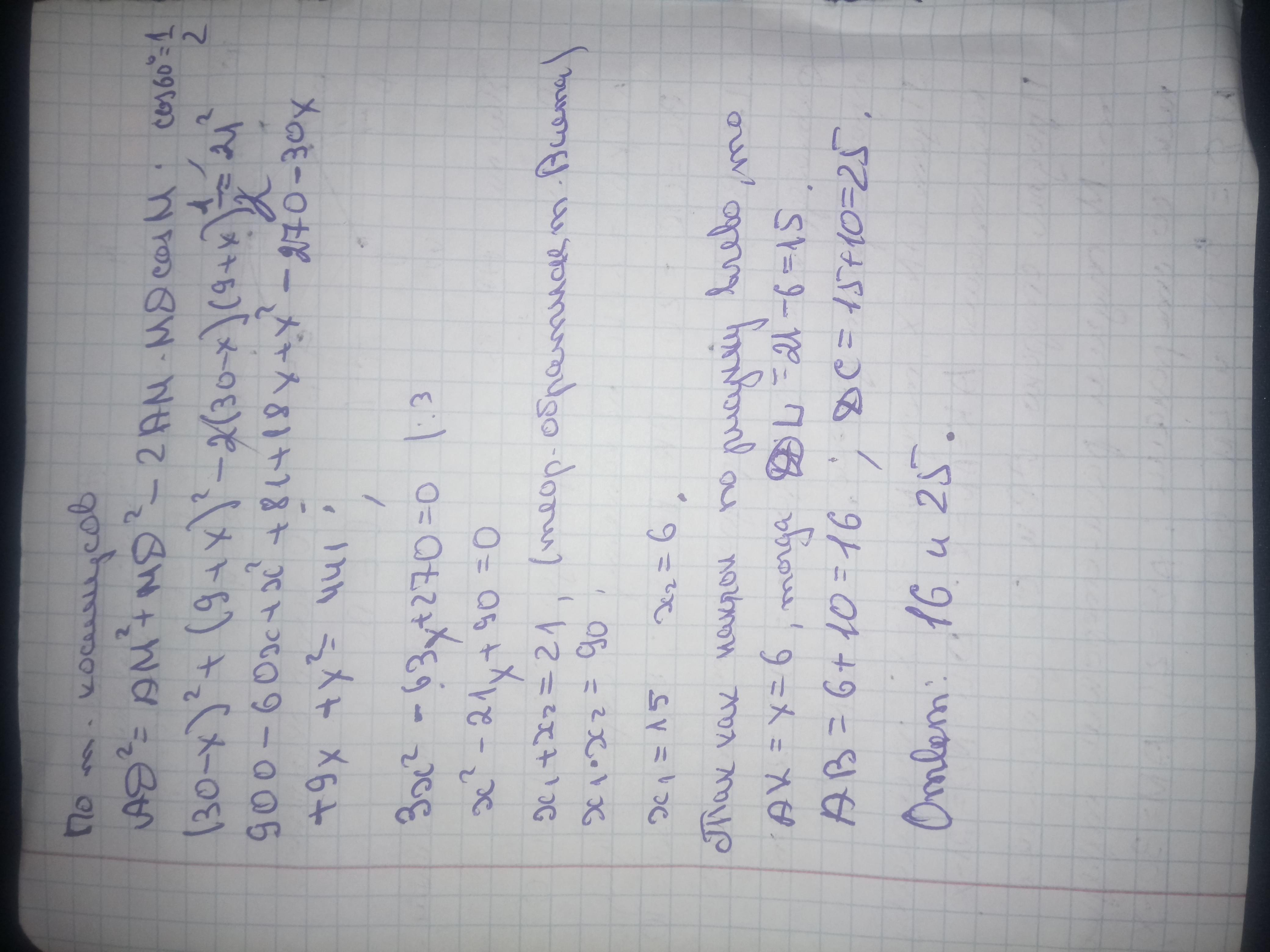 Из центра окружности провести 2-а радиуса ⇒ОМ и ОP в точки касания касательных АВ и DС соответственно⇒∆ОМВ=∆ОРС (по катету и противолежащему) ⇒ОВ=ОР, а ВМ=СP=10. Пусть АВ∩DC =Е⇒ЕА+ЕD=39 дальше ЕА=х ,а ЕD= 39-x и теорема косинусов для ∆АЕК в итоге квадратное с корнями 15 и 24