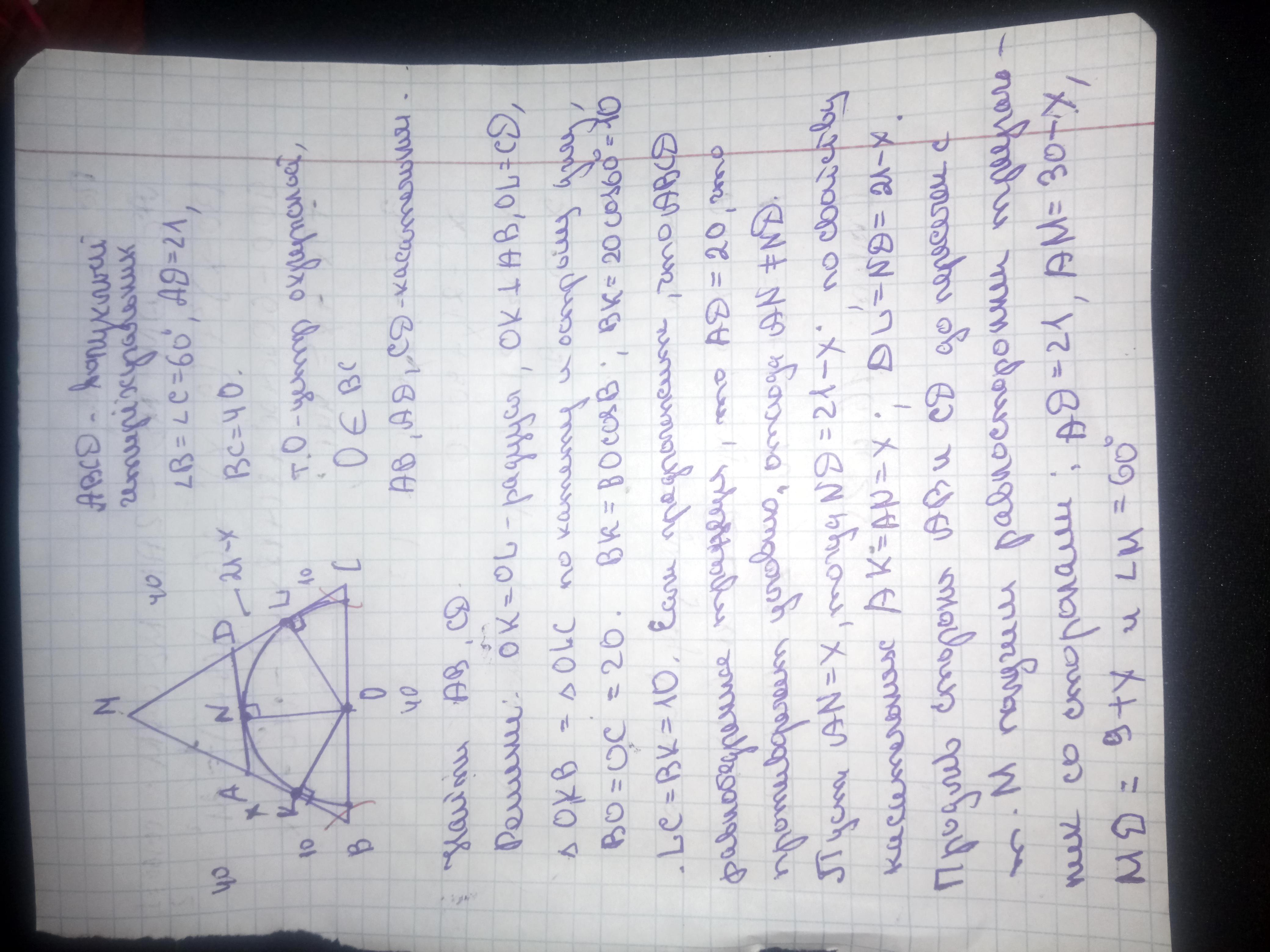 Из центра окружности провести 2-а радиуса ОМ и ОP в точки касания касательных АВ и DС соответственно⇒∆ОМВ=∆ОРС (по катету и противолежащему) ⇒ОВ=ОС, а ВМ=СP=10. Пусть АВ∩DC =Е⇒ЕА+ЕD=39 дальше ЕА=х ,а ЕD= 39-x и теорема косинусов для ∆АЕК в итоге квадратное с корнями 15 и 24