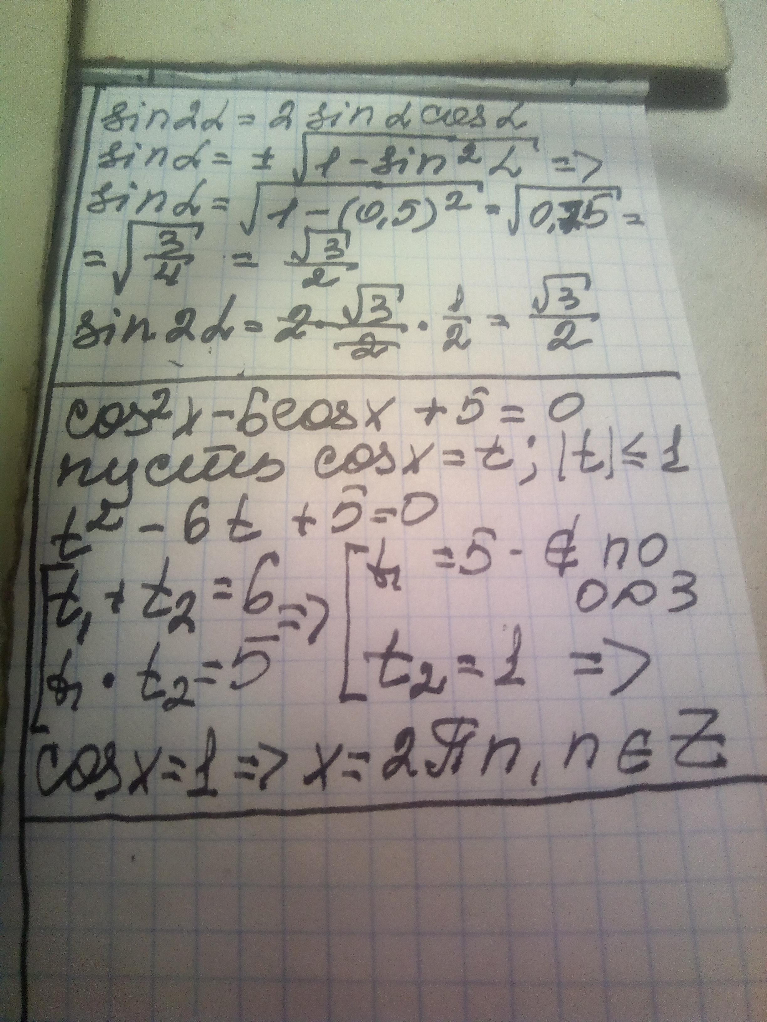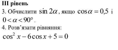 Угол в первой четверти, его косинус равен 0,5=½. Угол α=60°. sin2α=sin120°=√3/2. Это самый легкий способ решить третье задание.