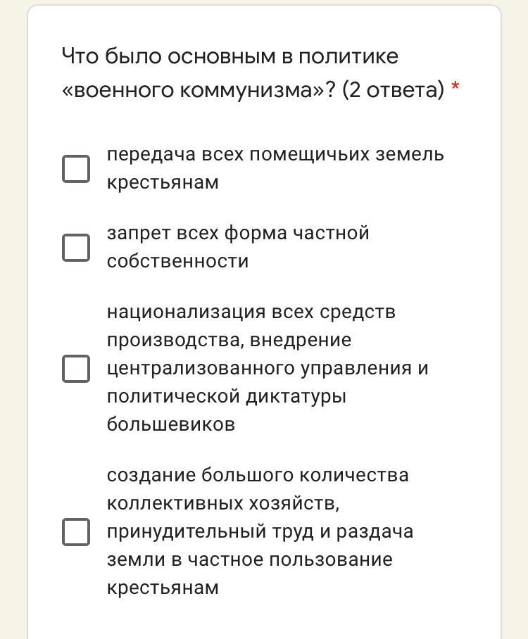 Основным в политике «военного коммунизма» были национализация всех средств производства, внедрение централизованного управление и политической диктатуры большевиков (самое главное!) и запрет всех форм частной собственности.