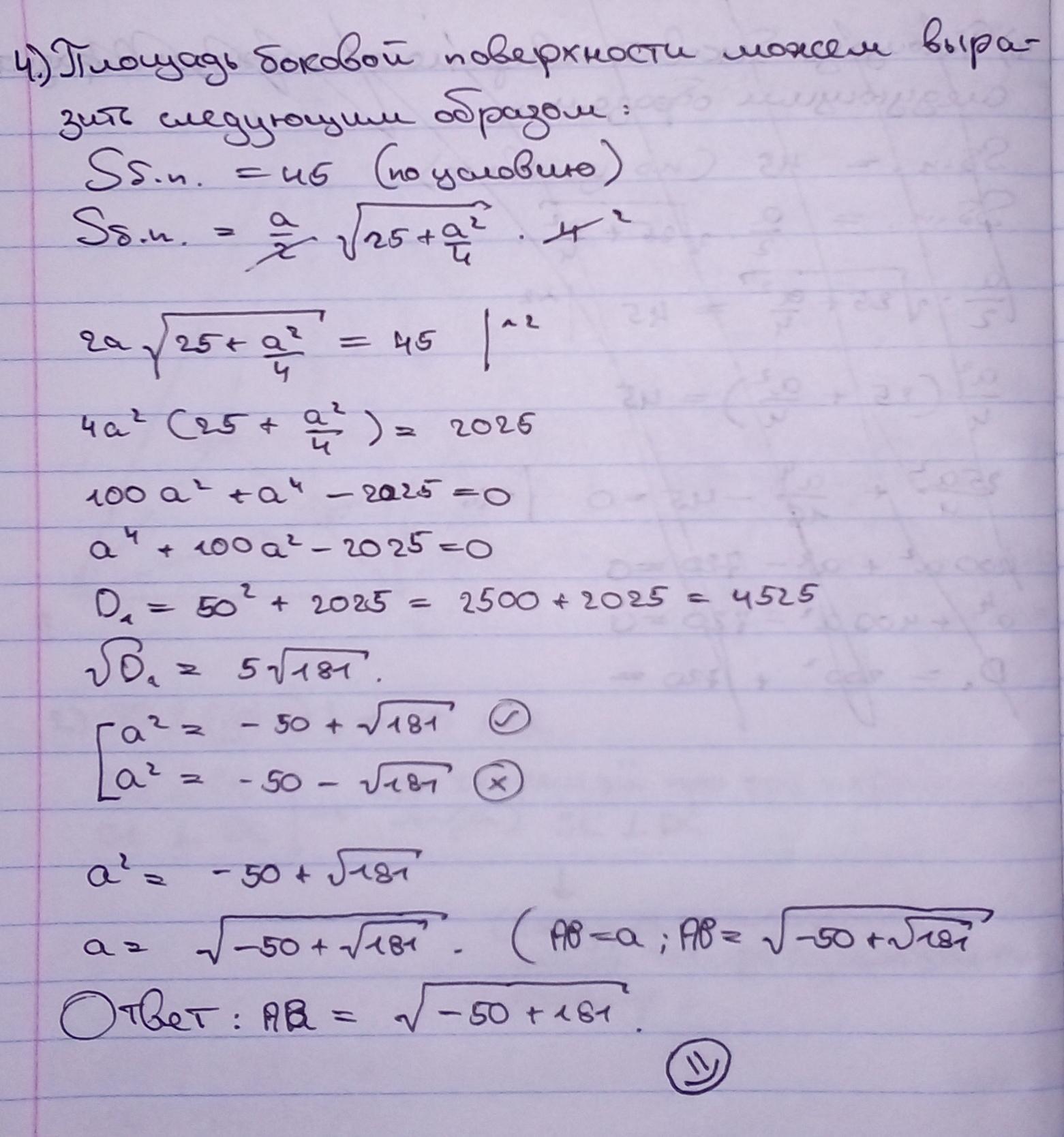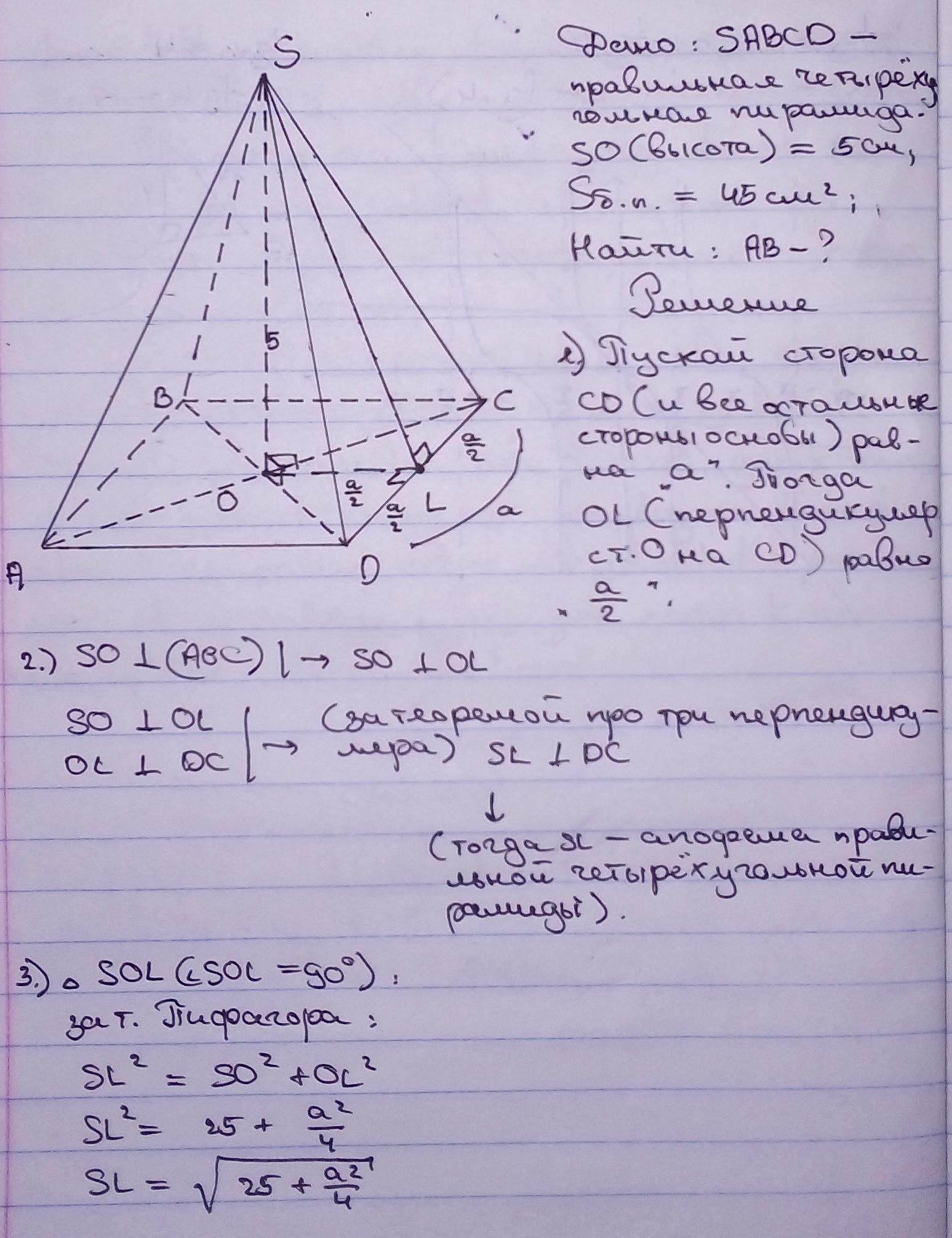 Определить сторону основания правильной четыреугольной пирамиды если её высота 5 см, а площадь боковой поверхности 45 см^2