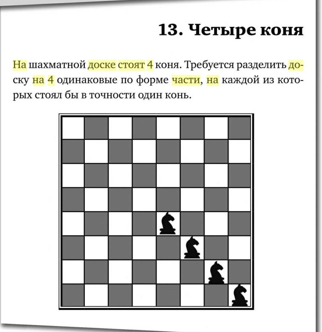 На шахматной доске 64 клетки(8*8=64), которые нужно делить на 4 коня. Получаем 16 клеток на каждого коня.