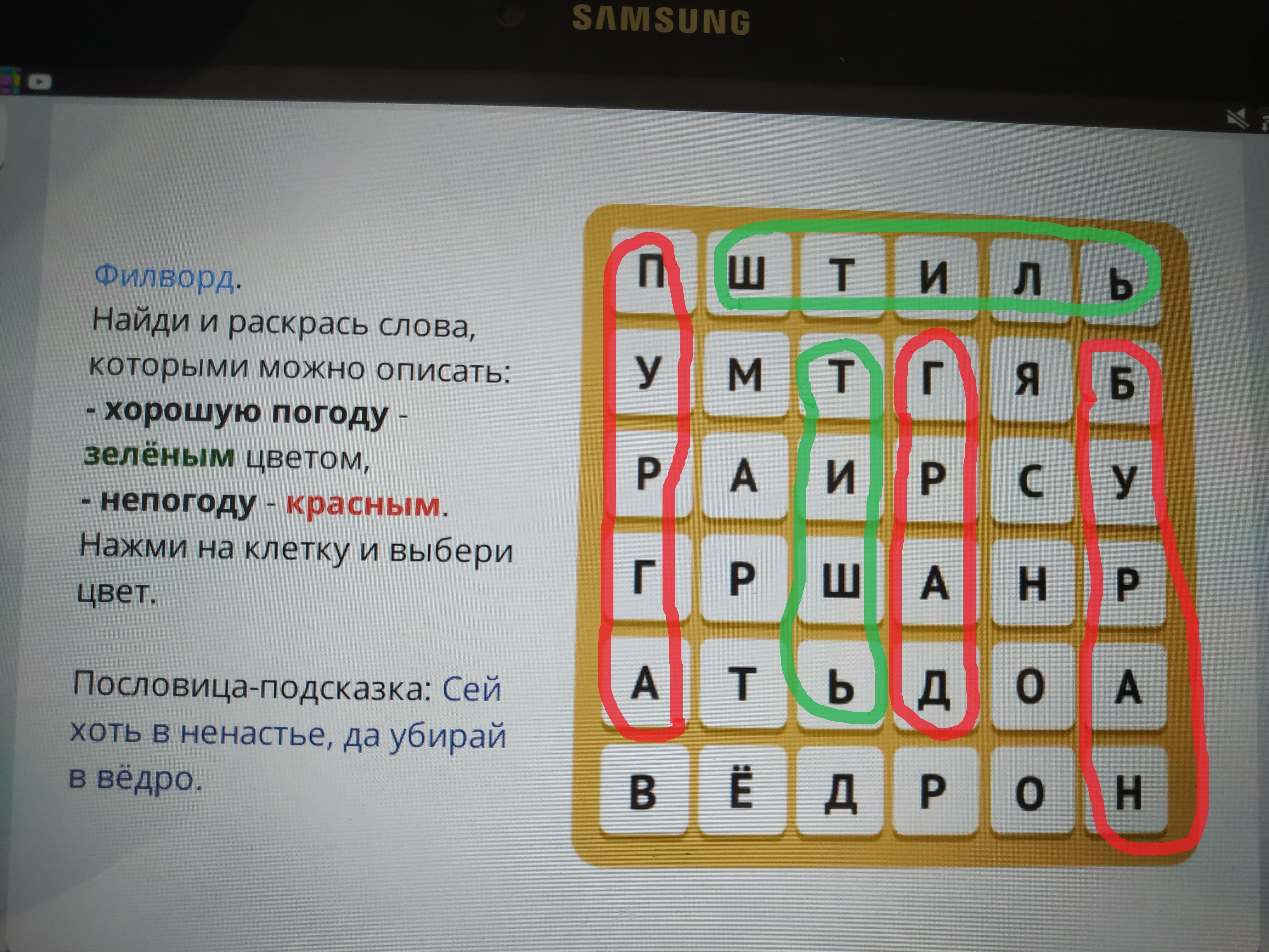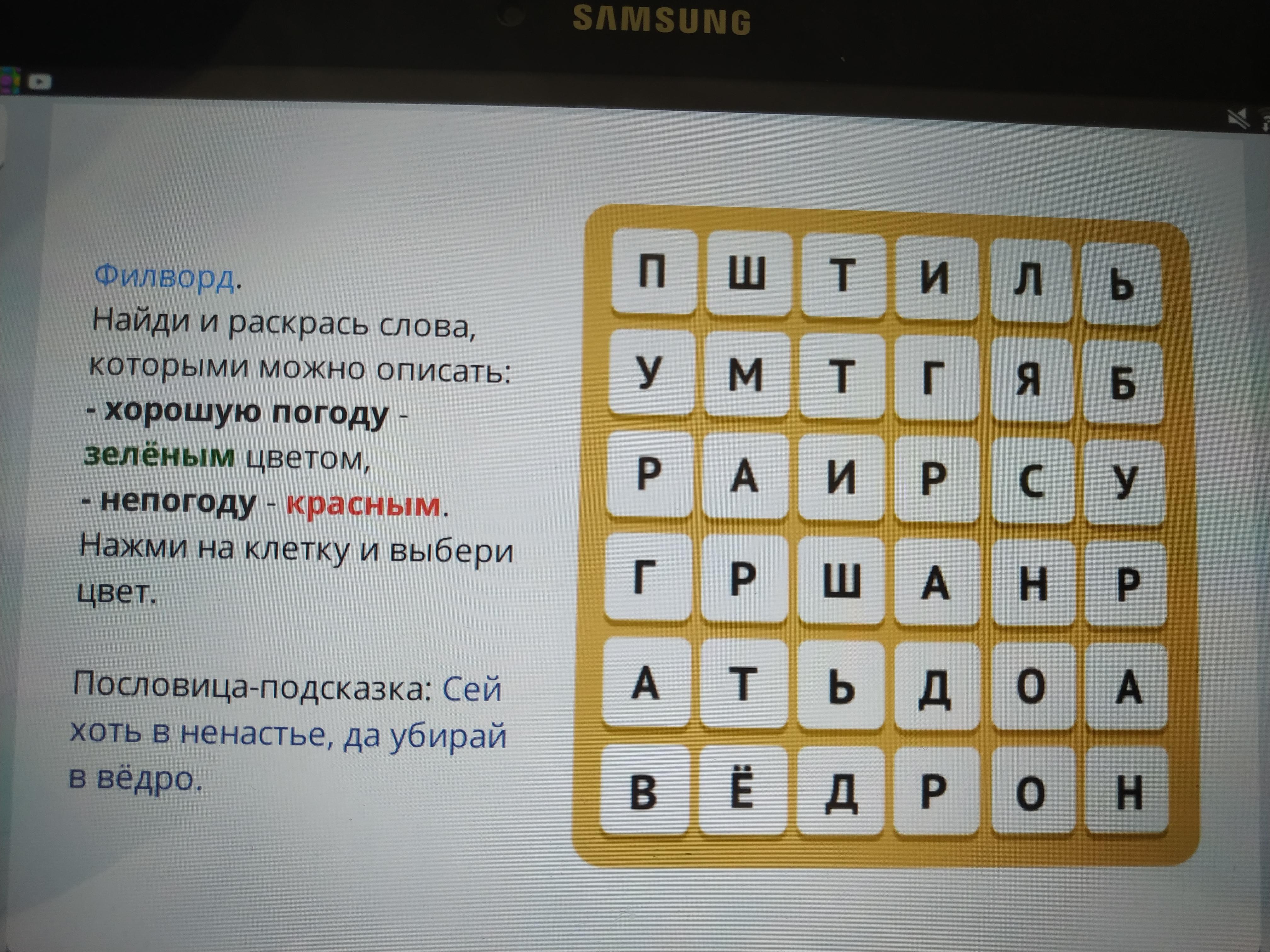 Помогите пожалуйста, Найди и раскрась слова которымии можно описать хорошую погоду - зеленым цветом. Непогоду - красным. Подсказка пословица Сей хоть в ненастье, да убирай в ведро