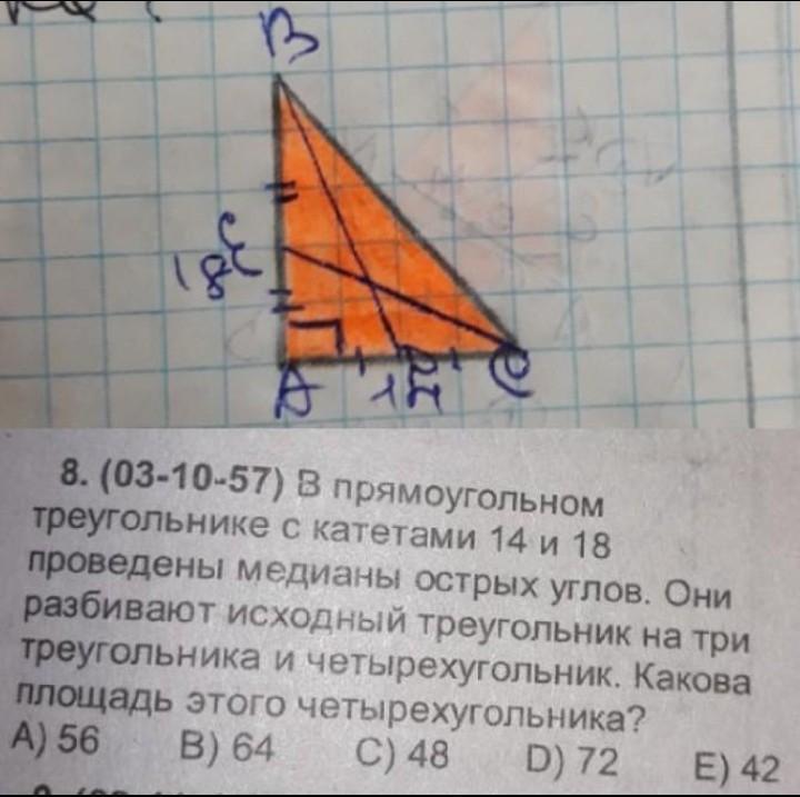 s=1/2ab=14*18=72(разбиваются на 3 треугольника и четырех угольник) поэтому результат таков 14*18=72+18=90 из них срабатывает деление на 3 треугольника 90/3= 30 и четырехуольник будет 42 потому что 4 угла 42+30=72