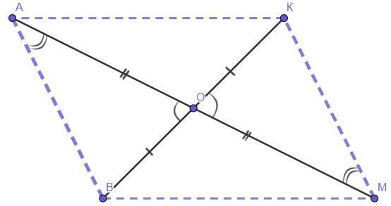 Точка О — серединная точка для отрезков АМ и ВК (ОА = ОМ ; ОВ = ОК).