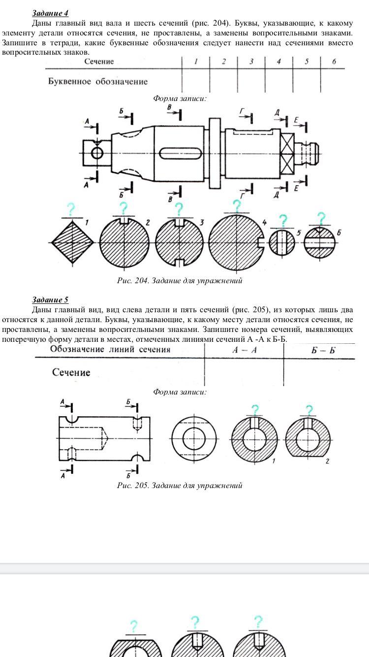 Даны главный вид, вид слева детали и пять сечений (рис. 205), из которых лишь два относятся к данной детали. Буквы, указывающие, к какому месту детали относятся сечения, не проставлены, а заменены вопросительными знаками. Запишите номера сечений, выявляющих поперечную форму детали в местах, отмеченных линиями сечений А -А к Б-Б.