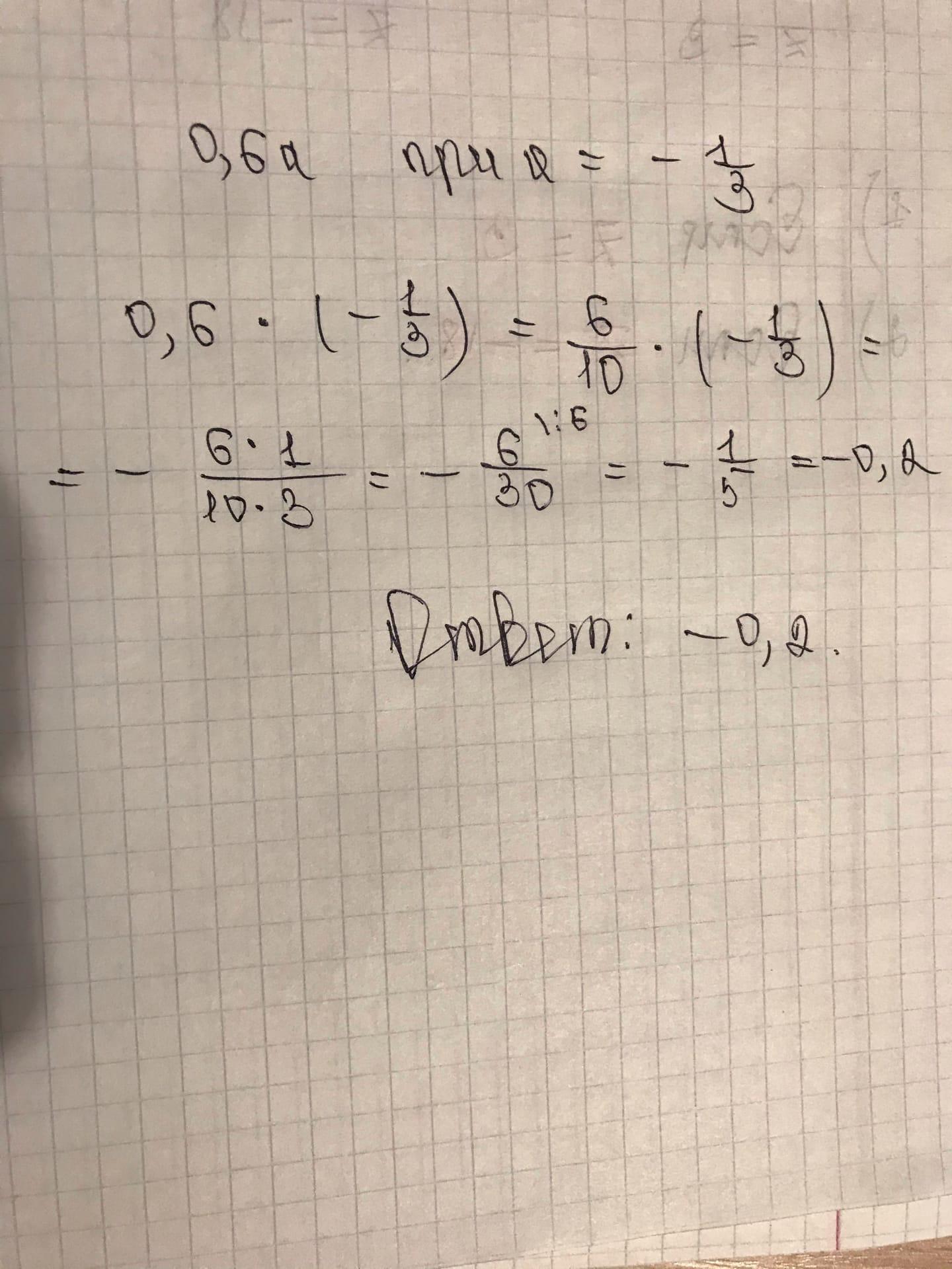 0,6а — это произведение двух чисел 0,6 на а. Следовательно, если а = 1/3, то это произведение будет равно 0,6*(1/3) = (6/10)*(1/3) = (3/5)*(1/3) (тройки сокращаются) = 1/5 = 0,2.