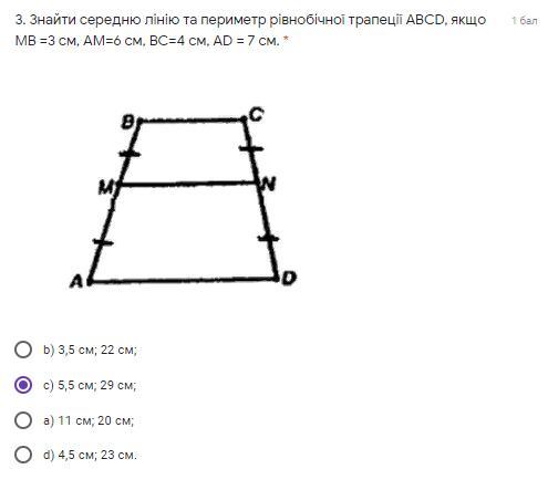 MN = ( 4+7)/2 = 5.5 см