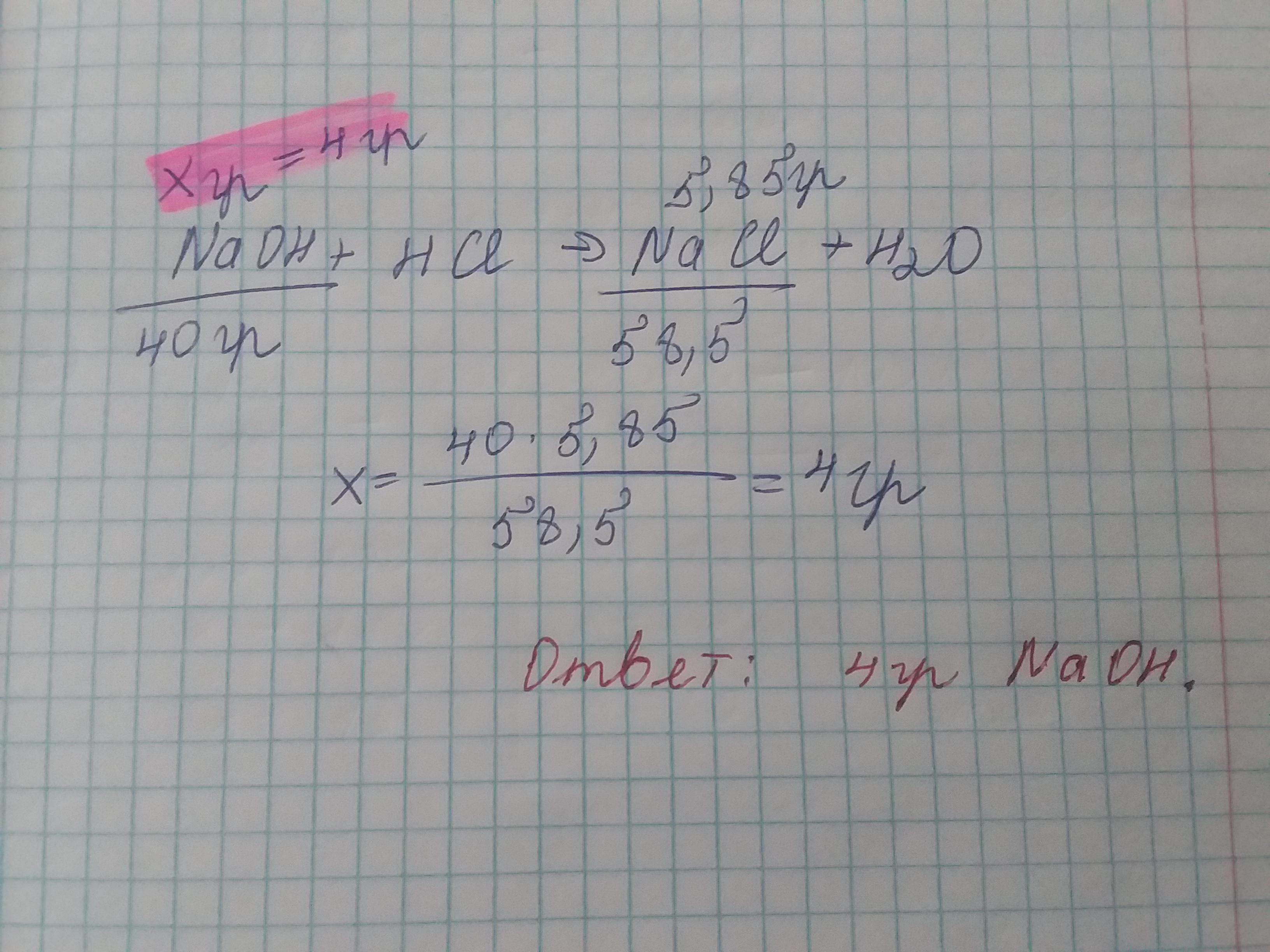 x = 5,85 гр × 40 гр/моль / 58,5 гр/моль = 0,1 моль × 40 гр/моль = 4 гр ⇒ m(NaOH) = 4 гр