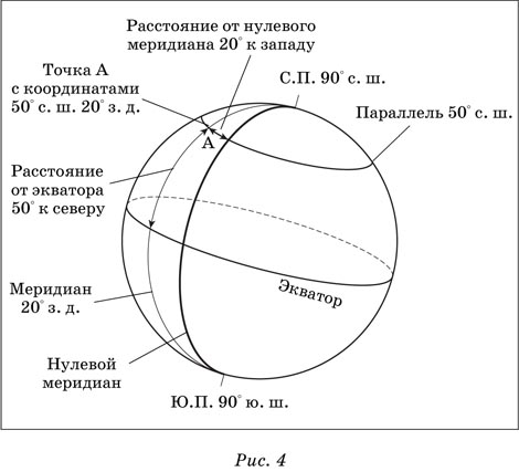 Градусная сеть и ее элементы. Градусная сеть Земли – система меридианов и параллелей на географических картах и глобусах, служащая для отсчета географических координат точек земной поверхности – долгот и широт – или нанесения на карту объектов по их координатам.Для создания градусной сети необходимы определенные точки отсчета. Шарообразная форма Земли определяет существование на земной поверхности двух неподвижных точек – полюсов. Через полюсы проходит воображаемая ось, вокруг которой вращается Земля.Географические полюсы – математически высчитанные точки пересечения воображаемой оси вращения Земли с земной поверхностью.Экватор – воображаемая линия на земной поверхности, полученная при мысленном рассечении эллипсоида на две равные части (Северное и Южное полушарие). Все точки экватора равноудалены от полюсов. Плоскость экватора перпендикулярна оси вращения Земли и проходит через ее центр. Полушария мысленно разделены еще множеством плоскостей, параллельных плоскости экватора. Линии их пересечения с поверхностью эллипсоида называются параллелями. Все они, как и плоскость экватора, перпендикулярны оси вращения планеты. Параллелей на карте и глобусе можно провести сколько угодно, но обычно на учебных картах их проводят с интервалом 10—20°. Параллели всегда ориентированы с запада на восток. Длина окружности параллелей уменьшается от экватора к полюсам. На экваторе она самая большая, а на полюсах равна нулю.При пересечении земного шара воображаемыми плоскостями, проходящими через ось Земли перпендикулярно плоскости экватора, образуются большие окружности – меридианы. Меридианы также можно провести через любые точки эллипсоида. Все они пересекаются в точках полюсов (рис.4). Меридианы ориентированы с севера на юг. Средняя длина дуги 1° меридиана: 40 008,5 км : 360° = 111 км. Длина всех меридианов одинакова. Направление местного меридиана в любой точке можно определить в полдень по тени от любого предмета. В Северном полушарии конец тени всегда показывает направление на север, в Южном – на юг.Градусная сеть необходима для отсчета географических координат точек земной поверхности – широты и долготы.Географическая широта – расстояние вдоль меридиана в градусах от экватора до какой-либо точки на поверхности Земли. Началом отсчета является экватор. Широта всех точек на нем равна 0. На полюсах широта составляет 90°. К северу от экватора отсчитывают северную широту, к югу – южную.Географическая долгота – расстояние вдоль параллели в градусах от начального меридиана до какой-либо точки земной поверхности. Все меридианы равны по длине, поэтому для отсчета необходимо было выбрать один из них. Им стал Гринвичский меридиан, проходящий недалеко от Лондона (там, где расположена Гринвичская обсерватория). Долгота отсчитывается от 0° до 180°. К востоку от нулевого