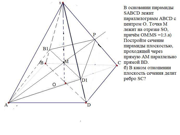 В основании пирамиды SABCD лежит параллелограмм ABCD с центром O. Точка M лежит на отрезке SO, причём OM:MS =1:3.