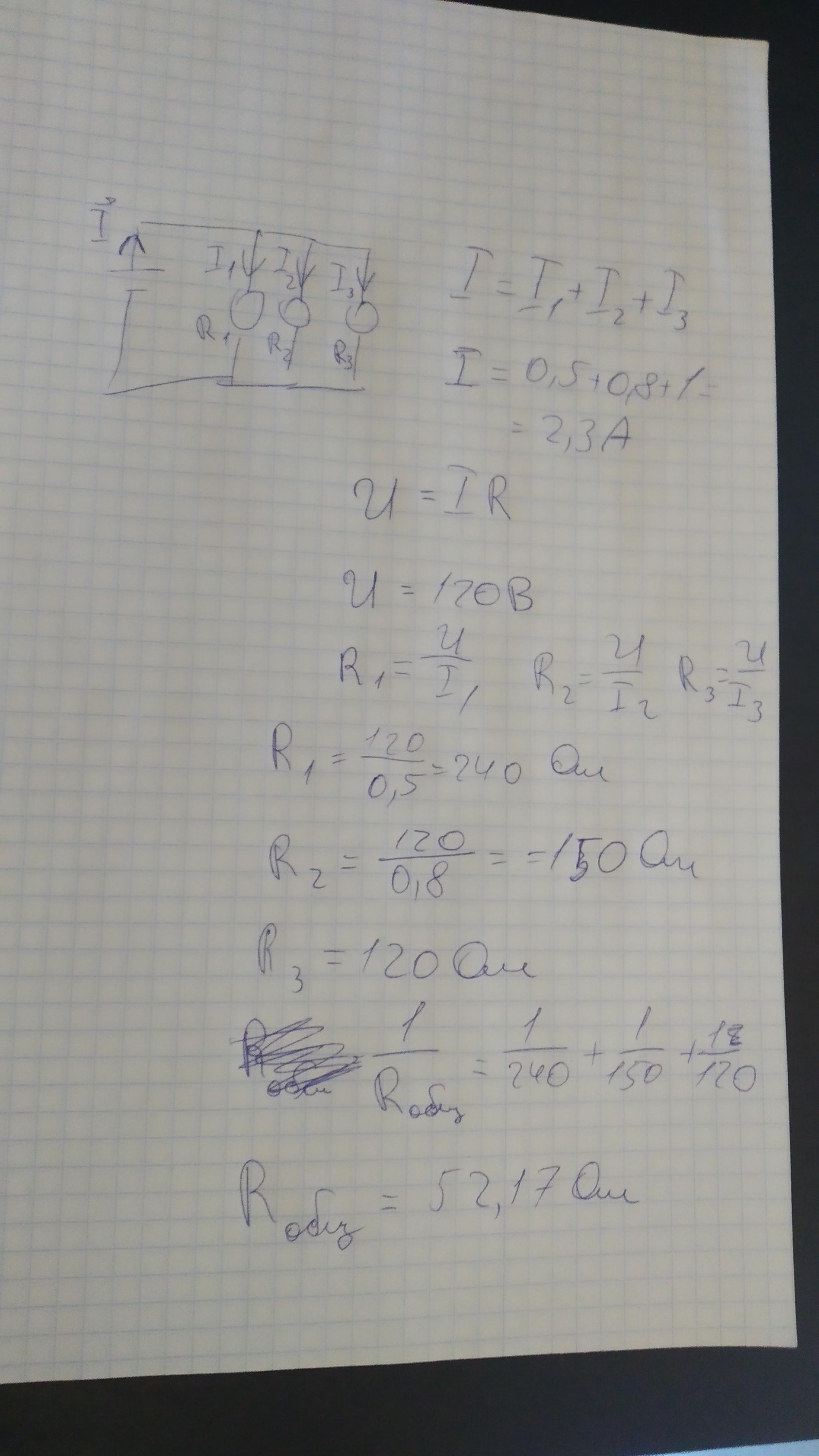 Даю 90 баллов! В осветительную сеть с напряжением 120 В включили параллельно 3 лампы. Силы тока в лампах соответственно равны 0,5; 0,8 и 1А. Определите силу тока в неразветвленной части цепи, сопротивление каждой лампы и общее сопротивление?