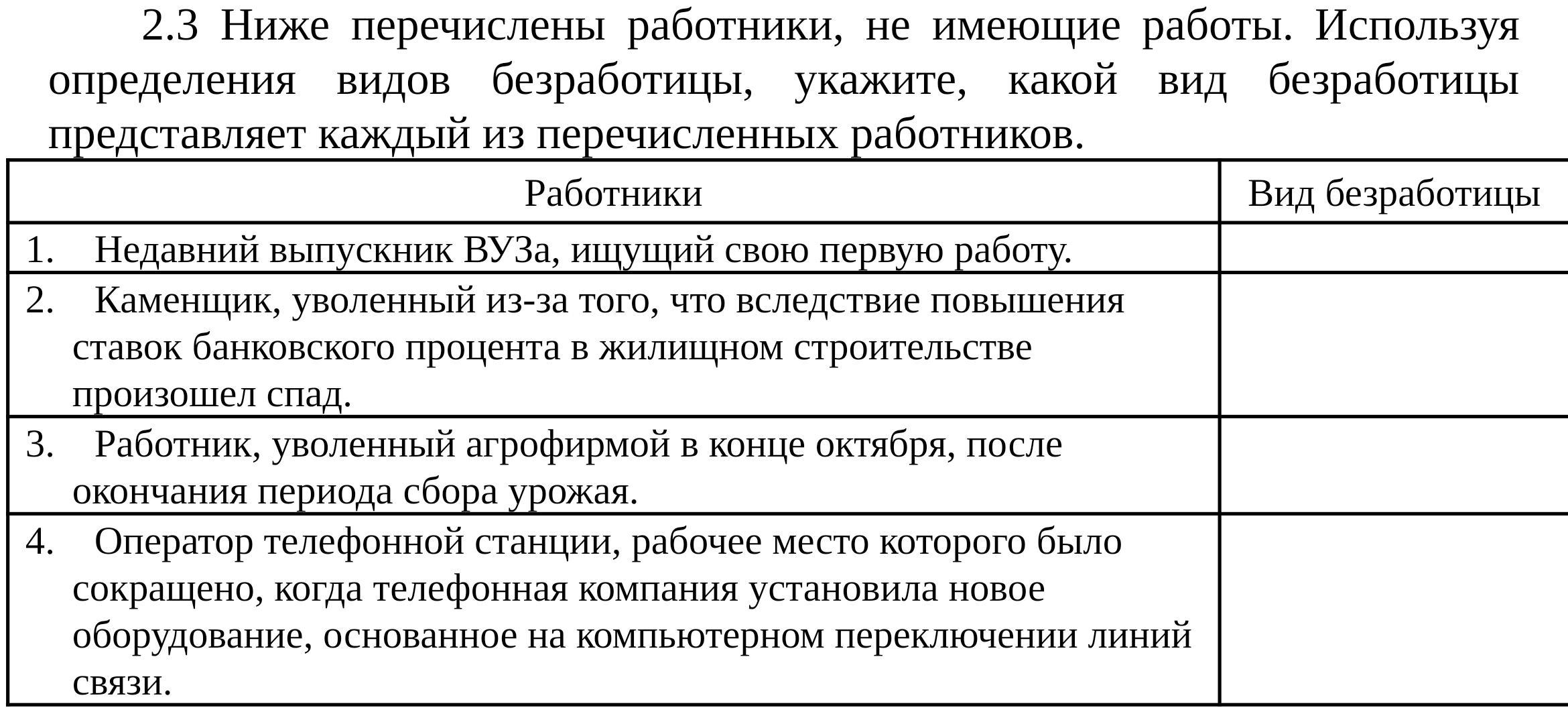 Ниже перечислены работники, не имеющие работы. Используя определения видов безработицы, укажите, какой вид безработицы представляет каждый из перечисленных работников.