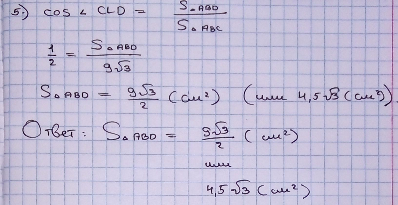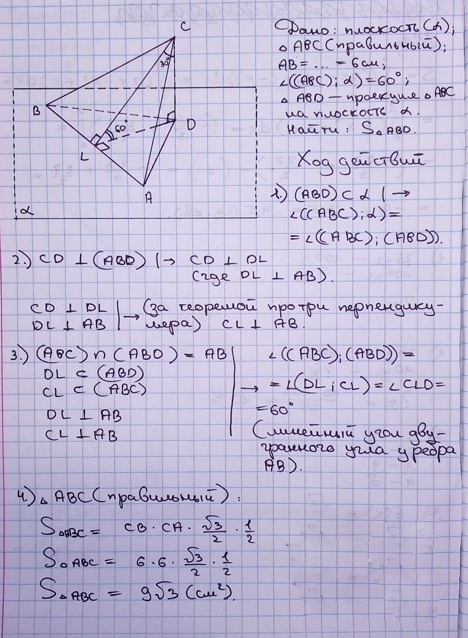 Доброго времени суток, такая задача по геометрии: Проекцией правильного треугольника ABC на плоскости, проходящей через ее сторону AB, является равнобедненный треугольник ABD . Угол между треугольником ABC и плоскостью 60° а сторона треугольника равна 6. Найдите площадь треугольника ABD .