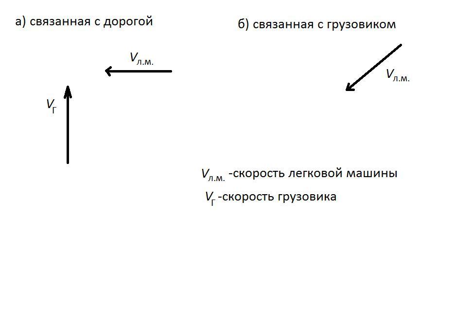 перекрестку приближается грузовик и легковая машина с разными скоростями. Изобразите на рисунке векторы скоростей автомобилей в системе отсчета: а) связанной с дорогой, и б) связанной с грузовиком