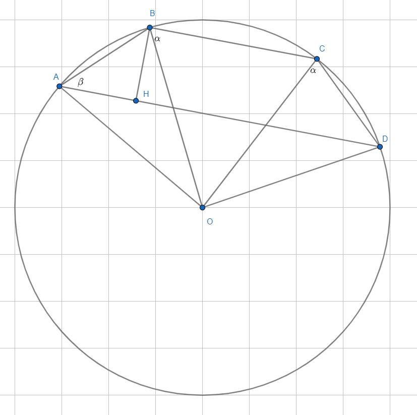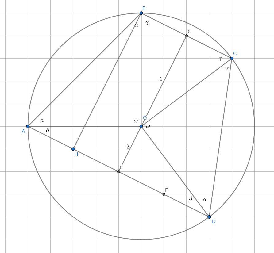Обратимся к первому рисунку. Пусть ∠AOB=∠COD=ω. Тогда ∠BAO=∠ABO=∠OCD=∠ODC=α (AO=OB=R и CO=OD=R => треугольники ABO и COD равнобедренные, в которых угол против основания общий, а => ). ΔAOD равнобедренный (AO=OD=R) => ∠OAD=∠ODA=β. Аналогично ∠OBC=∠OCB=γ. Т.к. четырехугольник вписан в окружность, то ∠BAD+∠BCD=180°. Значит: