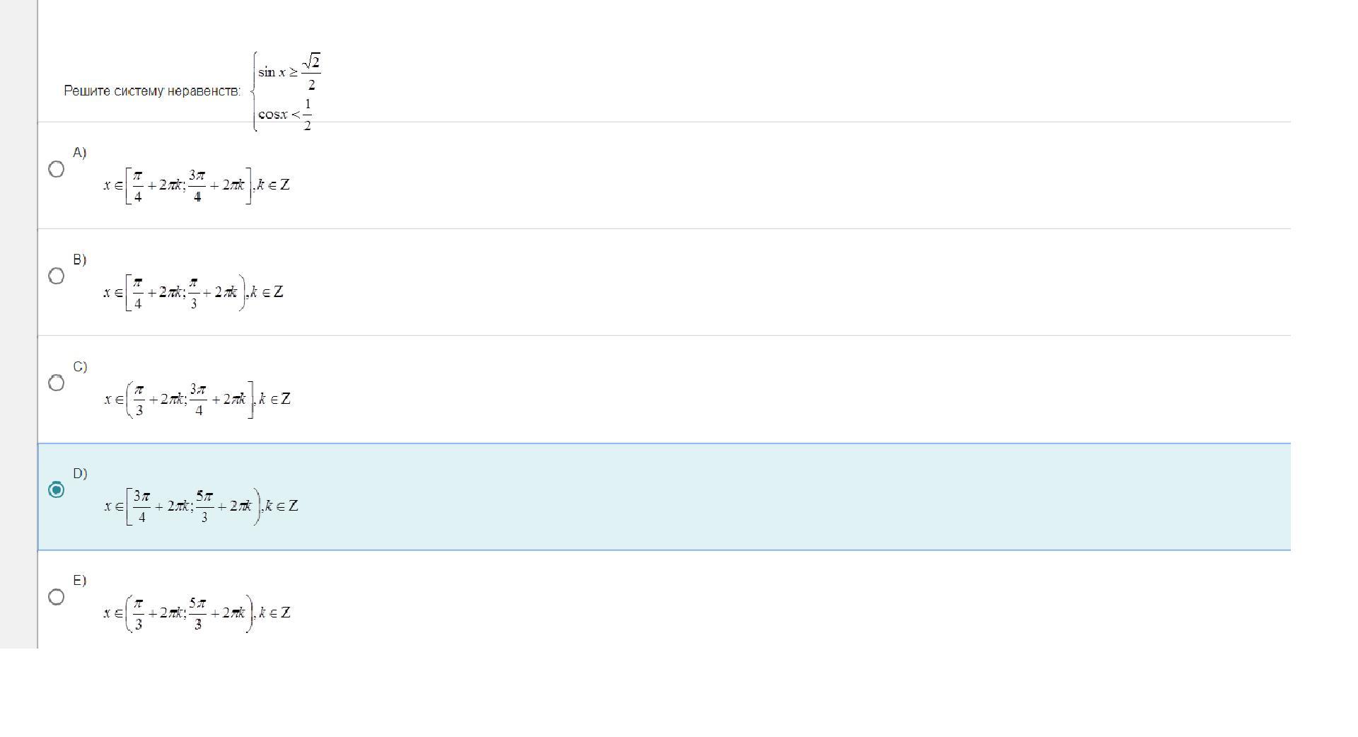 Ответ В не может быть, так как сos(pi/4)>1/2.